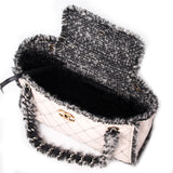 Details: Beige Quilted Leather / Antique Gold Hardware / Dual Chain-Link Tweed Shoulder Strap / Black and Ivory Tweed Trim at Front and Back / Black and White Tweed Lining / Single Compartment / Zip Pocket At Wall / Turn-Lock Closure at Front Fold-In Flap