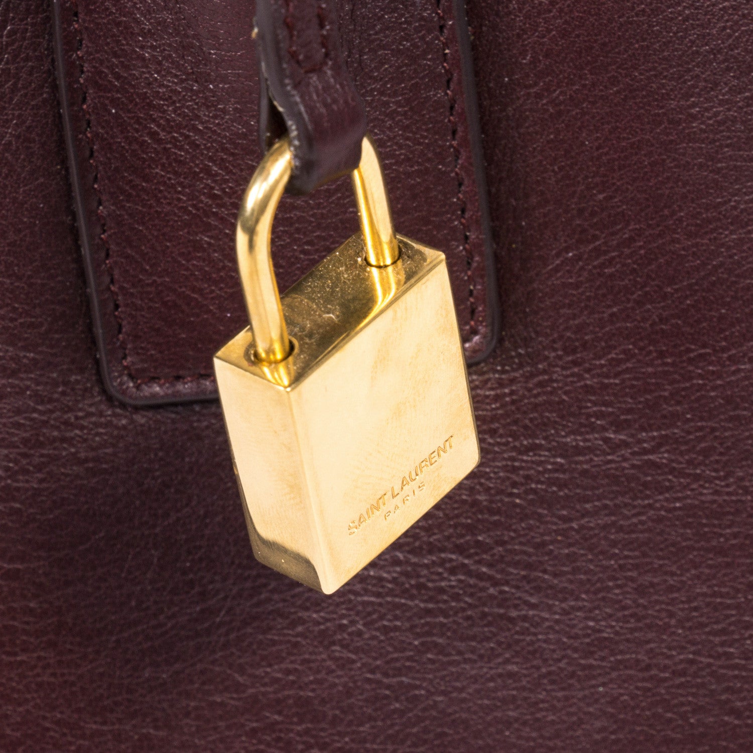 Details: Plum Leather / Small Size / Gold-Tone Hardware / Detachable Shoulder Strap / Dual Rolled Top Handles / Plum Suede Interior Lining / Three Interior Compartments / One Compartment With Zip Closure One Top / One Compartment With Two Pockets At Interior Wall / One Compartment With Zip Closure At Interior Wall