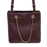 Details: Burgundy Leather / Gold Tone Hardware / Dual Chain-Link And Leather Handles / Single Shoulder Strap / Protective Studs At Base / Bow Embellishment At Front / Burgundy Satin Lining At Interior / Single Compartment / Dual Zip Pockets At Interior Walls