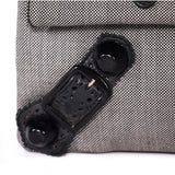Details: Grey Canvas With Black Leather Trim / Silver-Tone Hardware / Front Zip Pocket That Opens to The Back / Studs and Buckles Embellishments / Black Leather and Woven Lining / Dual Compartments / Magnetic Snap Closure at Front Flap