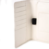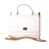 Details: White Grained Leather / Gold-Tone Hardware / Detachable Chain Link Shoulder Strap / Logo Plate at Front / Six Cards Slots / Three Bills Compartments / Phone and Mirror Pocket / Push Button Closure