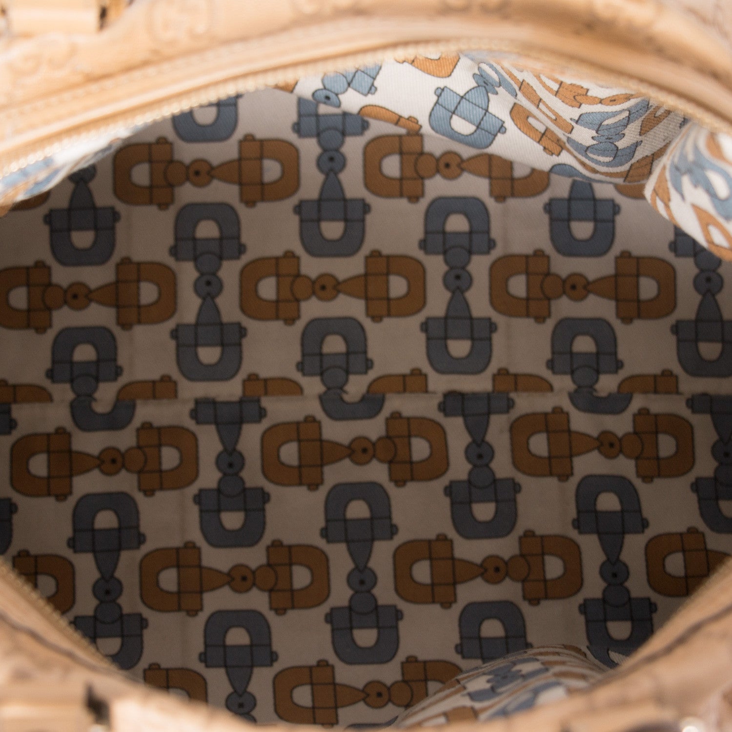 Details: Tan Guccissima Leather / Golden Brass Hardware / Embossed GG Initials Throughout The Leather / Dual Rolled Handles / Zip Closure On Top / Multicolor Interior Textile Lining / Single Pocket At Interior Wall