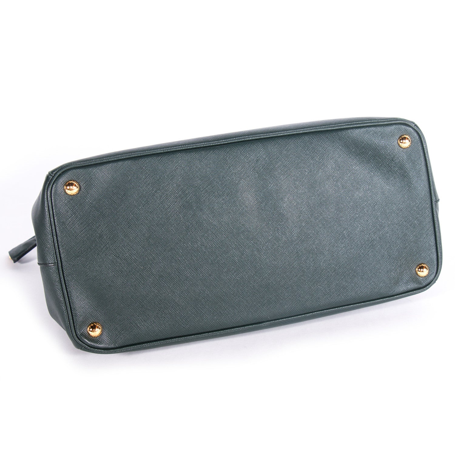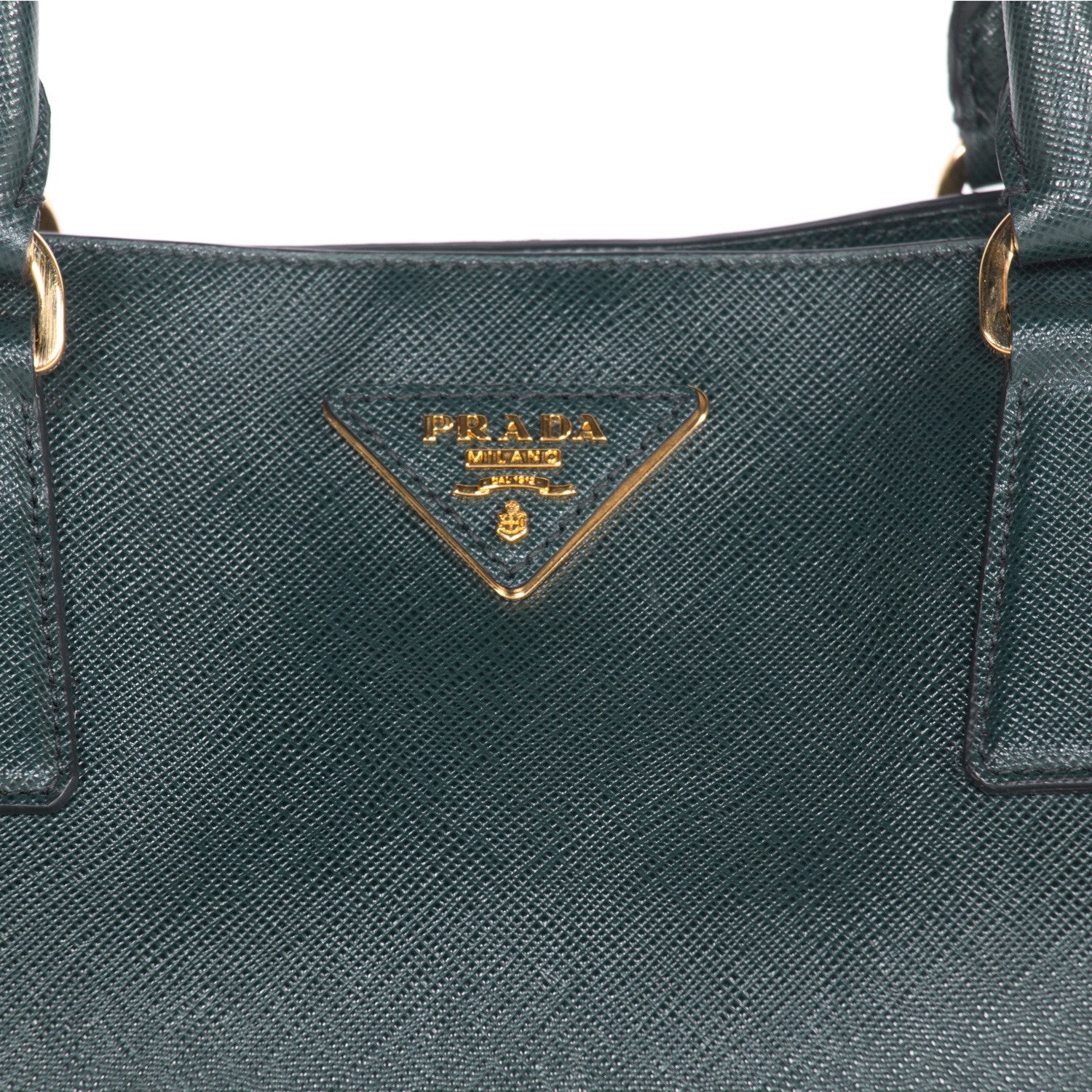 Details: Green Saffiano Leather / Gold Tone Hardware / Dual Rolled Top Handles / Logo Placard At Front / Black Interior Woven Lining / Dual Pockets At Wall / Single Slit Pocket / Zip Pocket At Interior Wall / Magnetic Snap Closure At Top