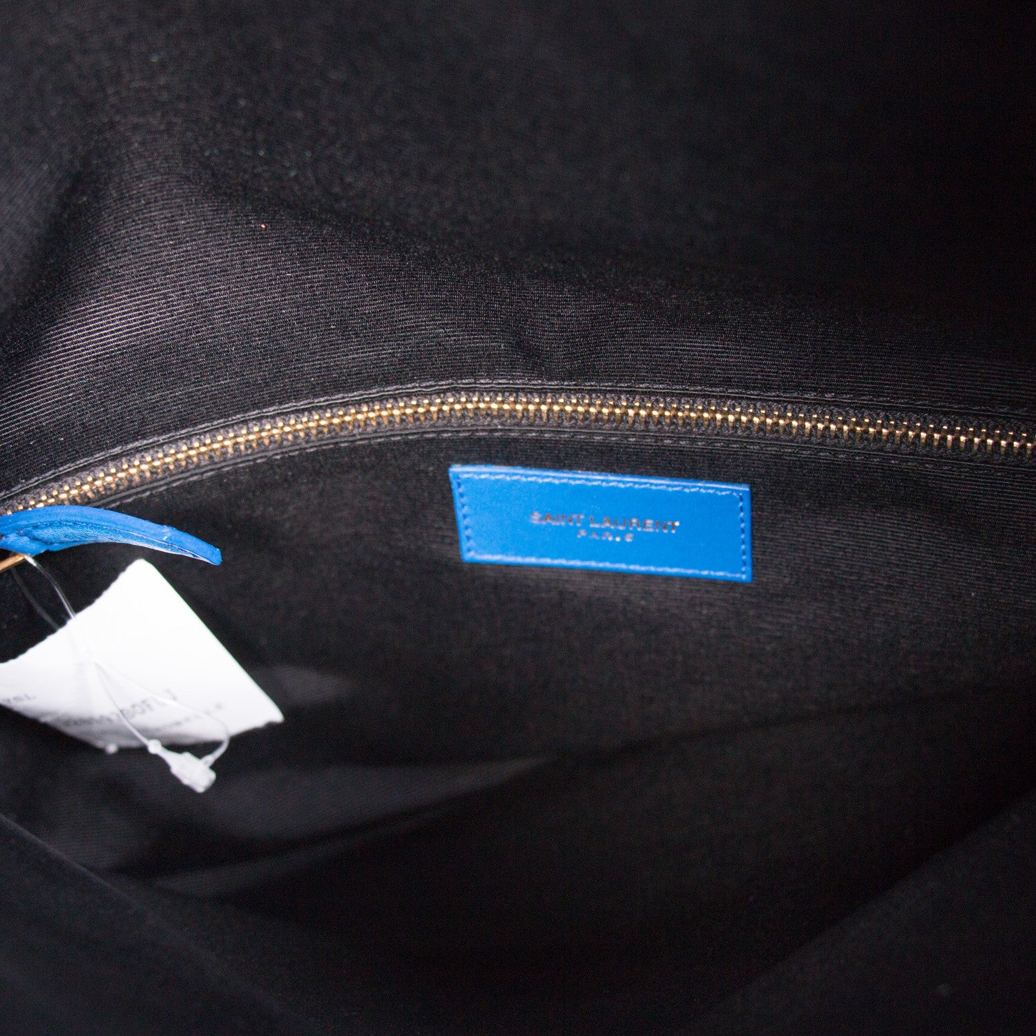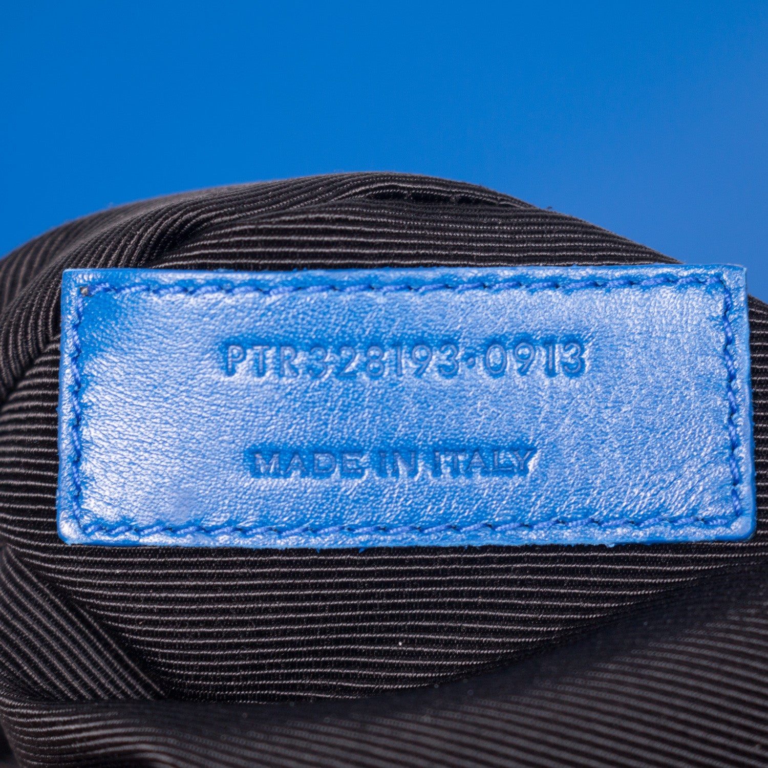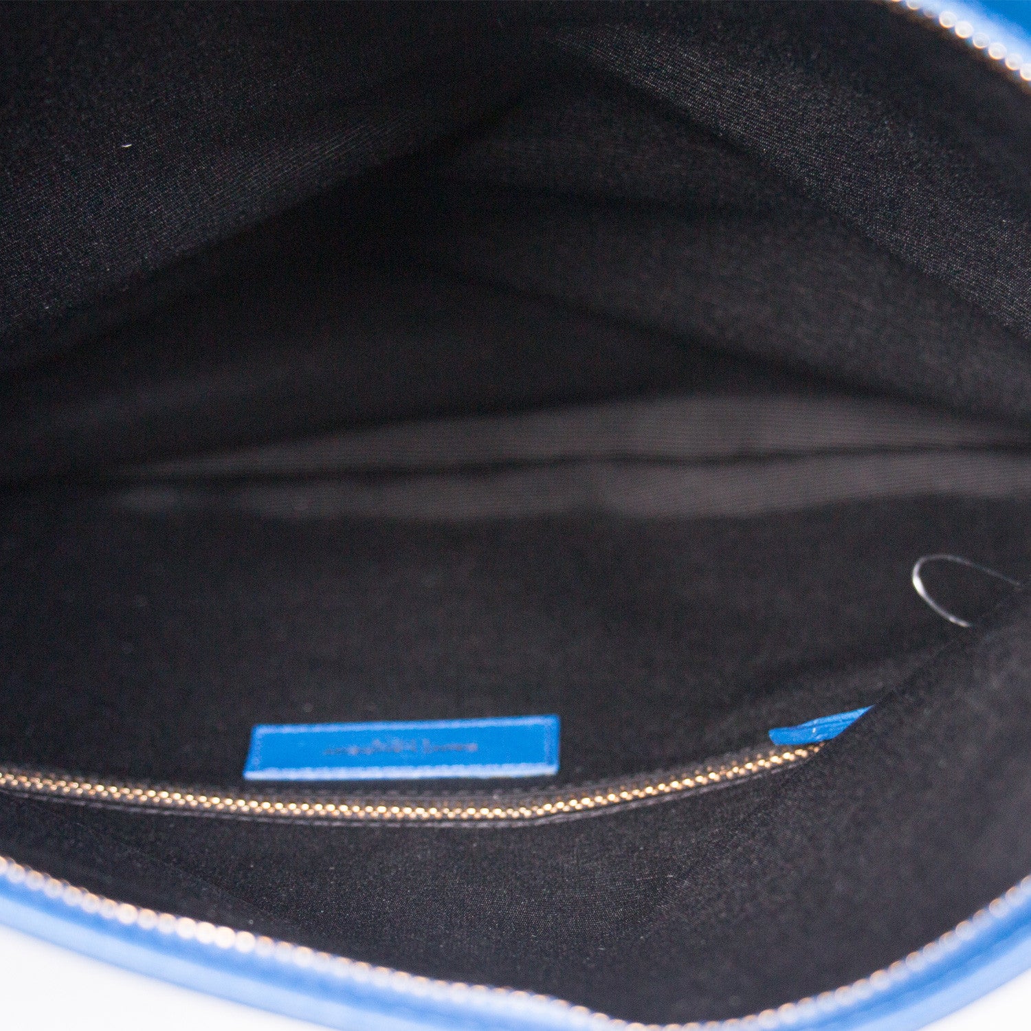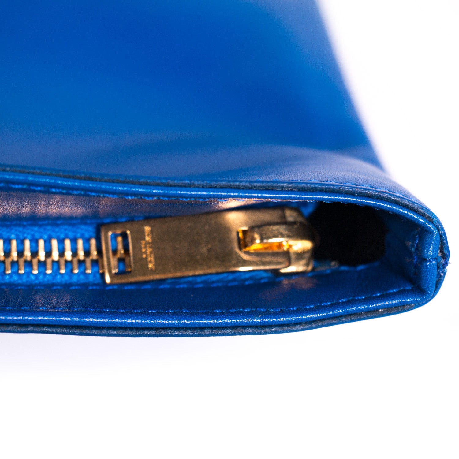 Details: Blue Sleek Leather / Gold-Tone Hardware / Fold-Over / Signature Logo At Front Flap / Grosgrain Interior Black Woven Lining / Single Compartment With Zip Pocket At Interior / Zip Closure At Top
