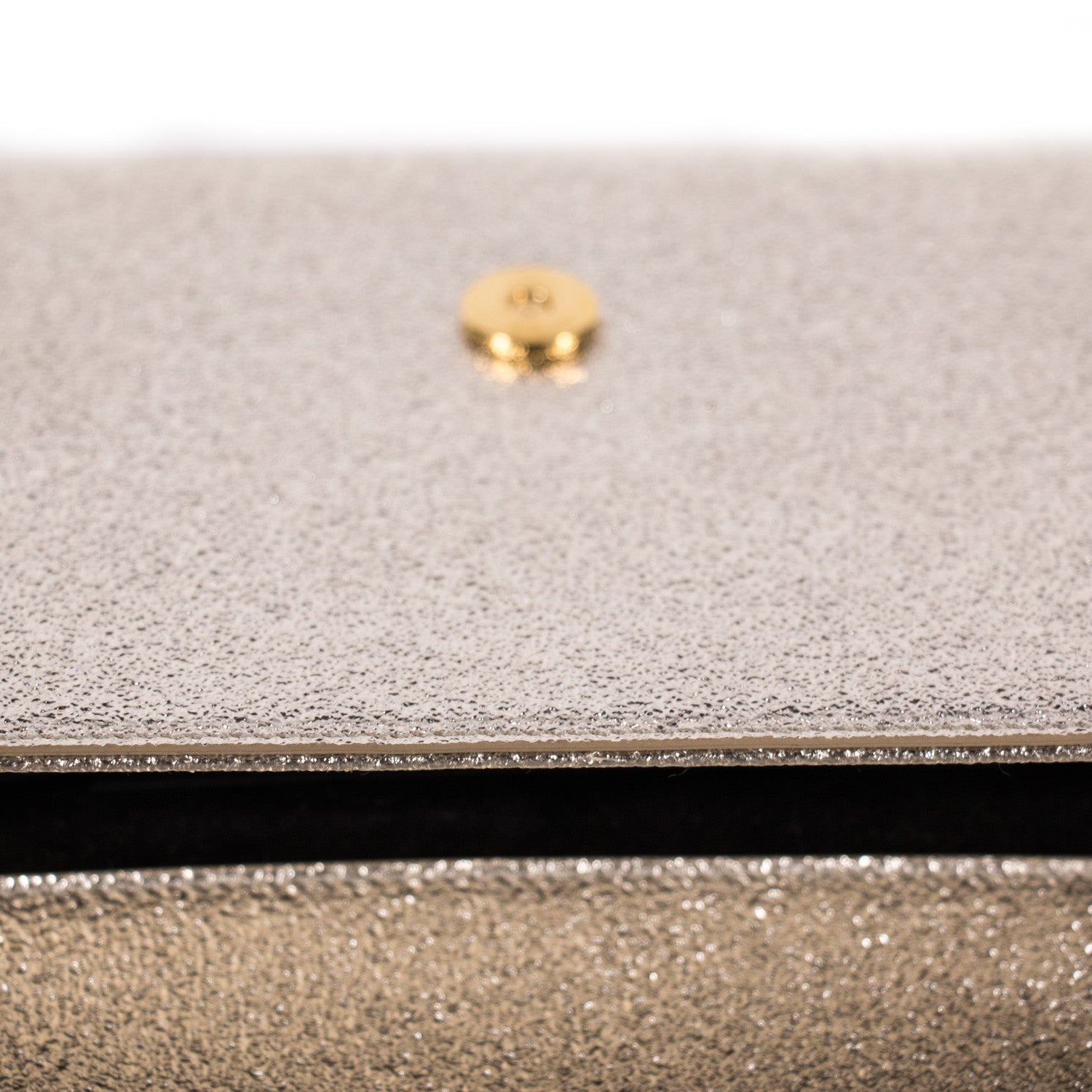 Details: Silver Metallic Leather / Gold-Tone Hardware / YSL Logo Adornment At Front In Gold-Tone / Single Compartment / Black Suede At Interior / Single Slit Pocket At Interior Wall / Flap Closure At Front With Magnetic Snap Closure