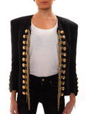 Details: Black Balmain Jacket / Silver-Tone And Gold-Tone Chain / Silver and Gold Button Closures at Sleeves and Center Front Hook and Eye Closures