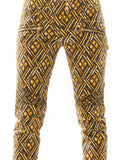 Details: Gold-Tone Print Embroidery Throughout / Dual Zip Pockets at Side / Dual Flap Pockets at Back / Dual Flap Pockets at Back / Zipper Detail at Ankles / Two Closure Gold Buttons