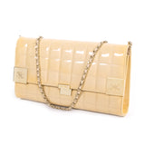 Details: Nude Patent Leather / Shoulder Bag With Removable Shoulder Strap / Chain Link With Leather / Gold Tone Hardware / Fold Over With Snap Closure / Single Compartment With Dual Slit Pockets At Interior Wall / Interior Calfskin Leather