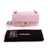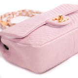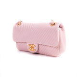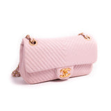Description: Pink Chevron Quilted Leather / Gold-Tone Hardware / Chain-Link and Leather Shoulder Strap / Single Compartment / Black Fabric Lining / Single Slit Pocket at Inside / Turn-Lock Closure at Front Flap