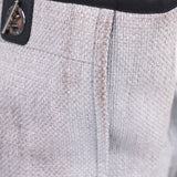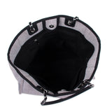 Details: Light Grey Canvas / Silver-Tone Hardware / Black Leather and Grosgrain Trim / Dual Shoulder Straps / Stencil Logo at Front Face / Black Woven Lining / Single Compartment with Three pockets at Interior wall / Snap Closure at Top