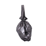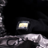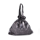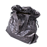 Details: Silver Metallic Nylon / Plastic Hardware / Prints Throughout / Dual Quilted Shoulder Straps / Black Woven Lining / Three Pockets One with Zipper Closure / Drawstring Closure at Sides