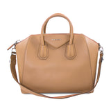 Details: Brown Tan Goatskin Leather / Silver-Tone Hardware / Dual Rolled Handles / Detachable Shoulder Strap / Logo at Front / Beige Fabric Interior Lining / Two Flat Pockets and One Zipper Pocket at Inside / Zipper Closure at Top