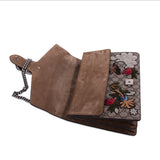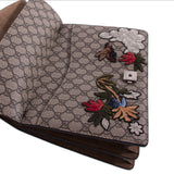 Details: Grey and Brown GG Coated Canvas / Patchwork Embroidery Throughout / Silver-Tone Hardware / Brown Suede Accent / Dual Chain Link / Exterior Pocket at Back / Pocket at Underside Flap / Suede Interior / Three Compartments, One with Zip Closure / Push-Lock Closure at Front Flap / Two-Headed Tiger Adornment