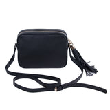 Details: Black Grained Leather / Gold-Tone Hardware / Adjustable Shoulder Strap / Logo at Front / Natural Canvas at Interior / Black Tassel / Dual Slit Pockets / Zipper Closure at Top