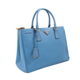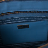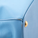 Details: Sky Blue Saffiano Leather / Gold-Tone Hardware / Dual Rolled Handles / Detachable Shoulder Strap / Three Compartments, Two with Zipper Closure / 3 Pockets at Inside, One with Zipper.