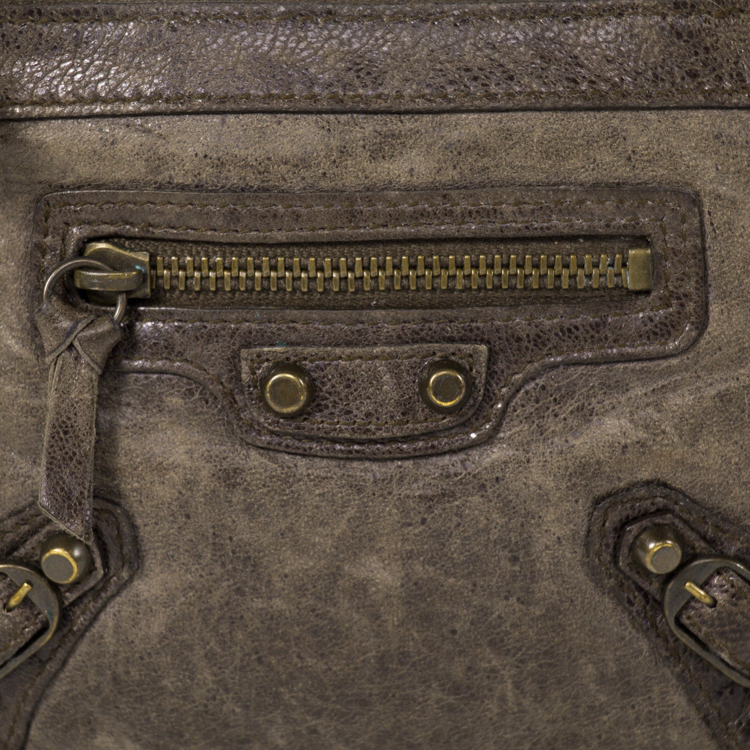 Details: Grey Leather / Brass Hardware / Exterior Zip Pocket At Front / Single Compartment / Black Fabric Interior Lining / Zip Closure At Top