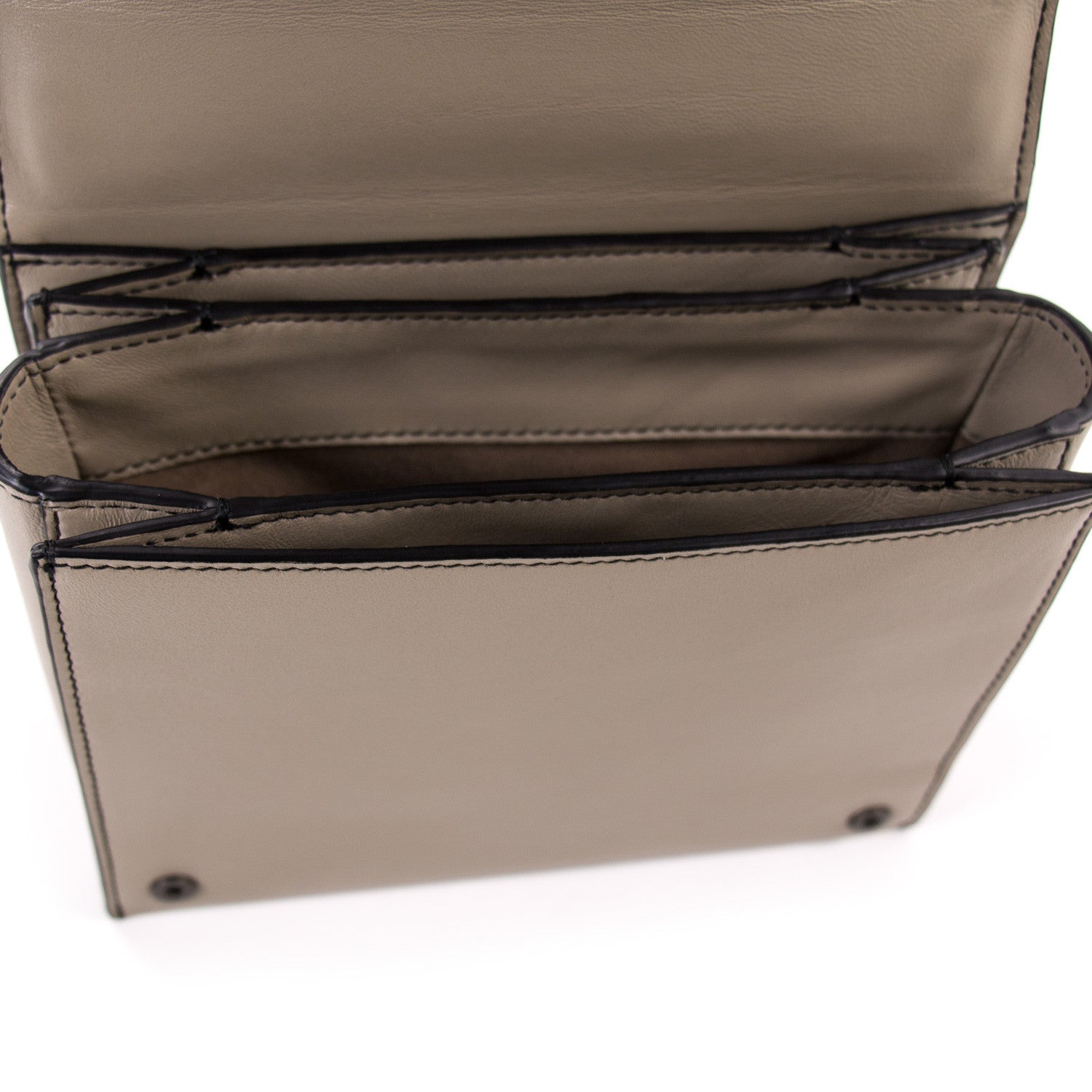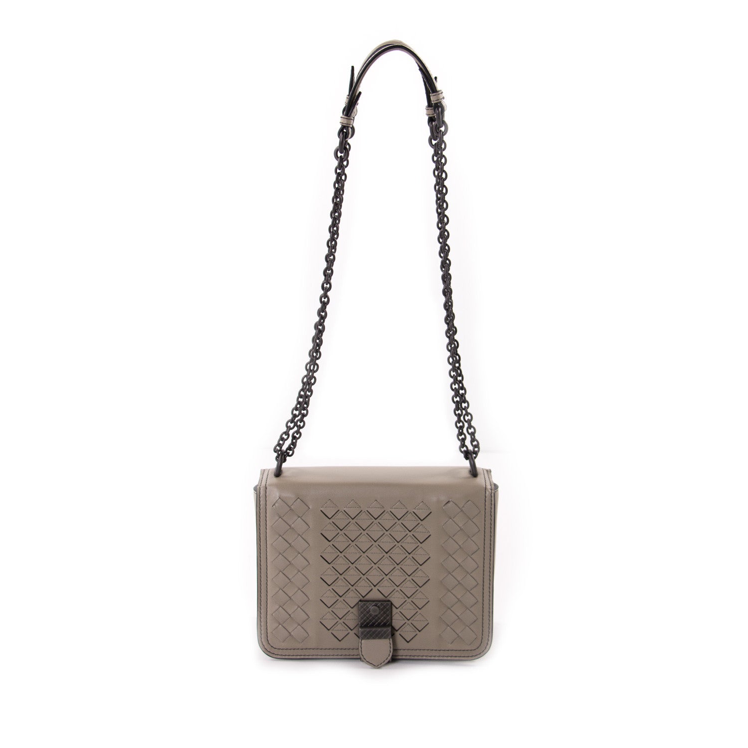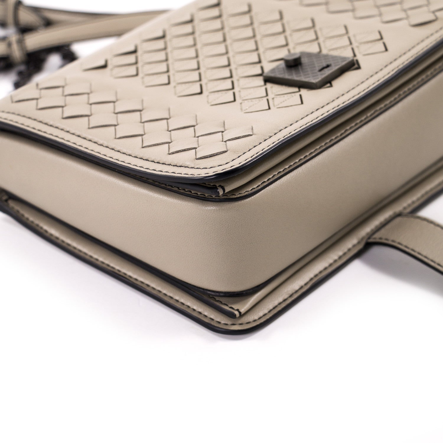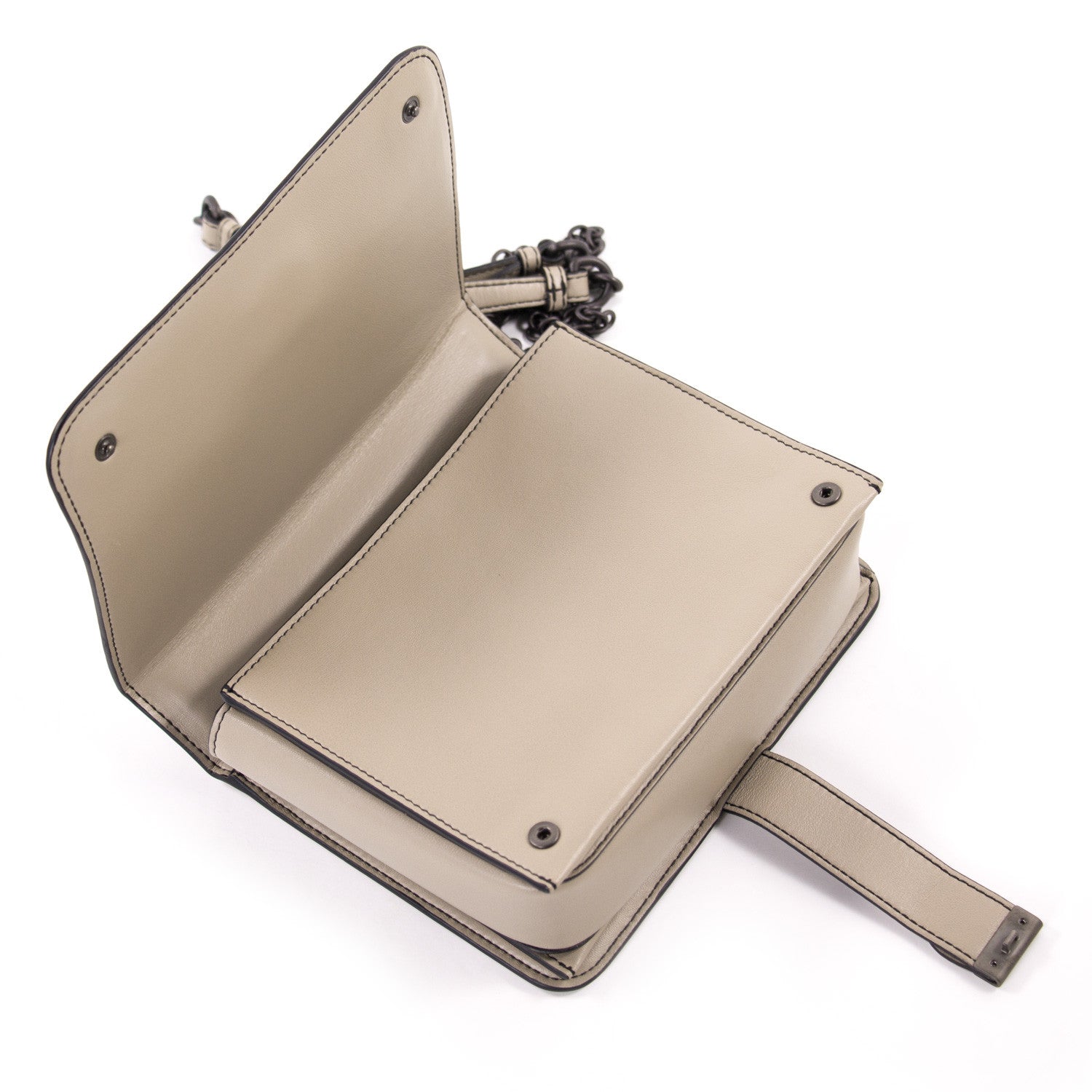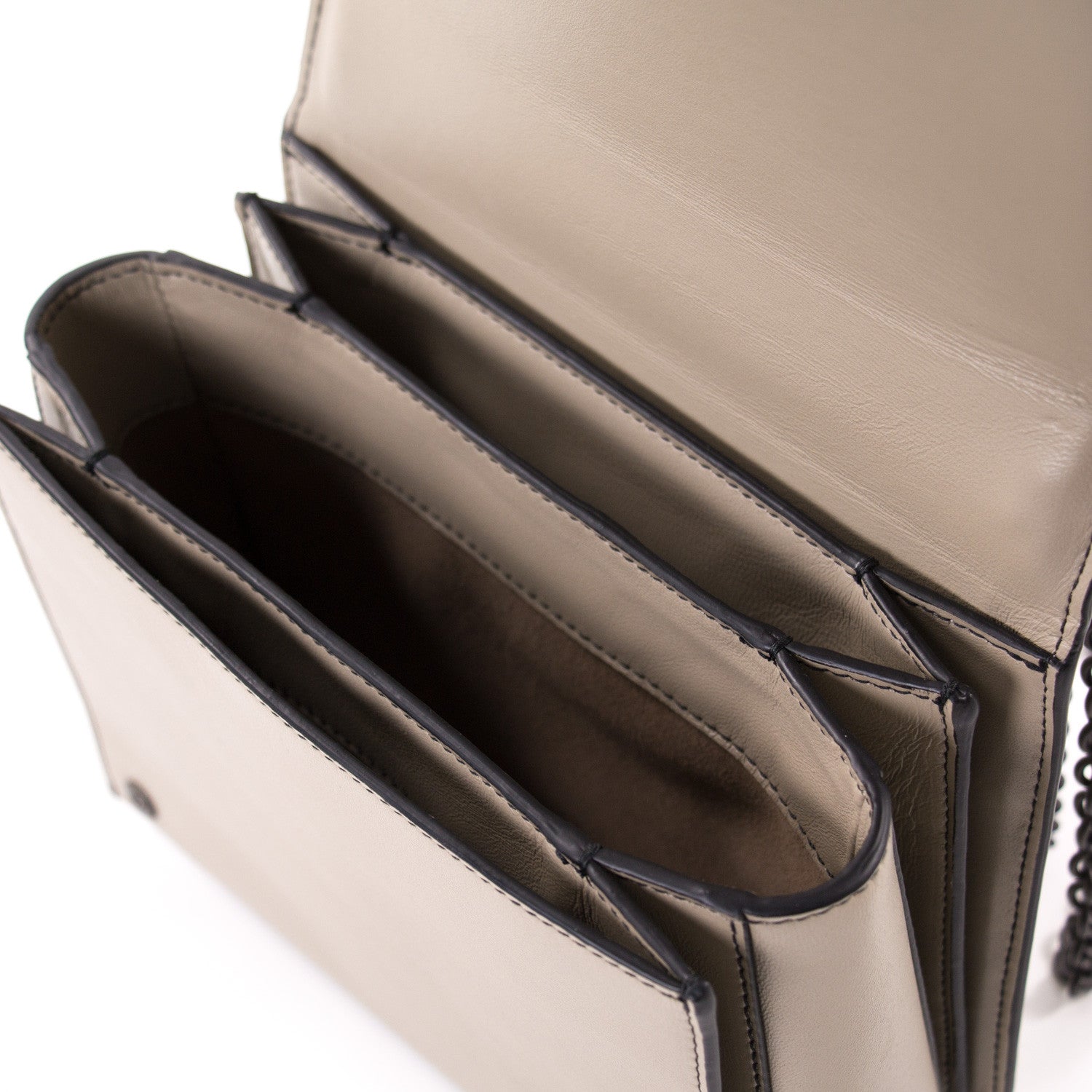 Details: Grey Nappa Leather / Black Metal Hardware / Chain-Link Shoulder Strap With Leather Pad / Suede Interior Lining / Flat Pocket at Inside / Three Compartments / Push Lock Closure at Flap With Engraved Gunmetal Lock at Exterior Front