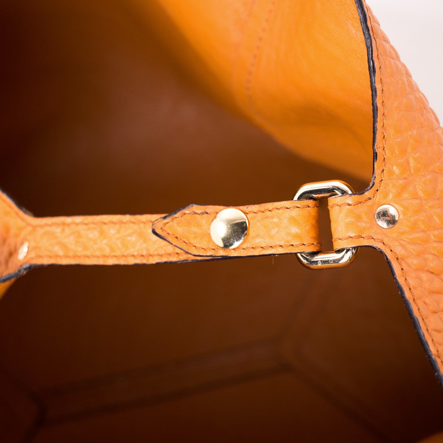 Details: Camel Embossed Check Grain Leather / Gold Tone Hardware / Dual Flat Shoulder / Protective Studs at Base / Leather Lining at Interior / Large Compartment / Magnetic Snap Closure / Detachable Zip Pouch