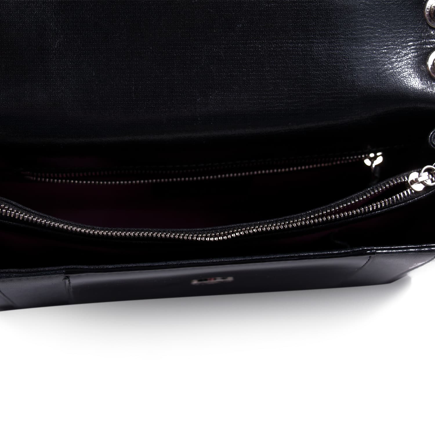 Details: Glazed, Soft and Patent Black Leather / Silver-Tone Hardware / Dual Snake Chain Shoulder Strap / Colored Serpenti Head Embellishment With Malachite Eye Accents / Logo Adornment At Exterior Back / Aubergine Woven Lining / Three Compartments At Interior One with Zip Closure / Dual Interior Wall pockets One With Zip Closure / Push Closure At Front Flap