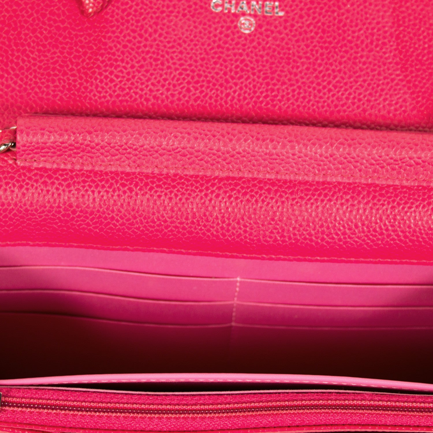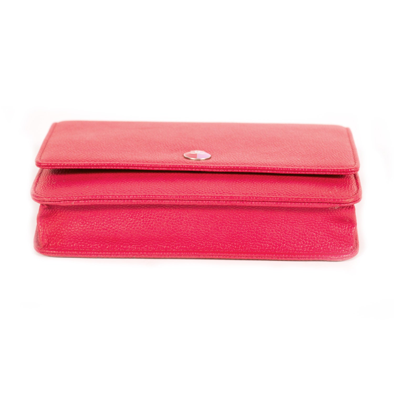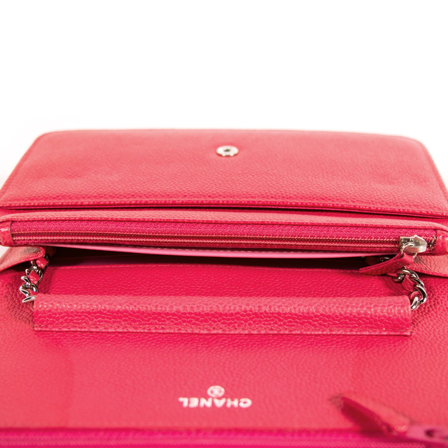 Details: Pink Caviar Grained Leather / Silver-Tone Hardware / Chain-Link Shoulder Strap With Pink Leather Accent / Interior Leather And Satin Lining / Single Compartment / Three Pockets At Interior, One With Zip Closure / Six Card Slots At Interior Wall / Zip Pocket Inside The Front Flap / Push Button Closure At Front Flap