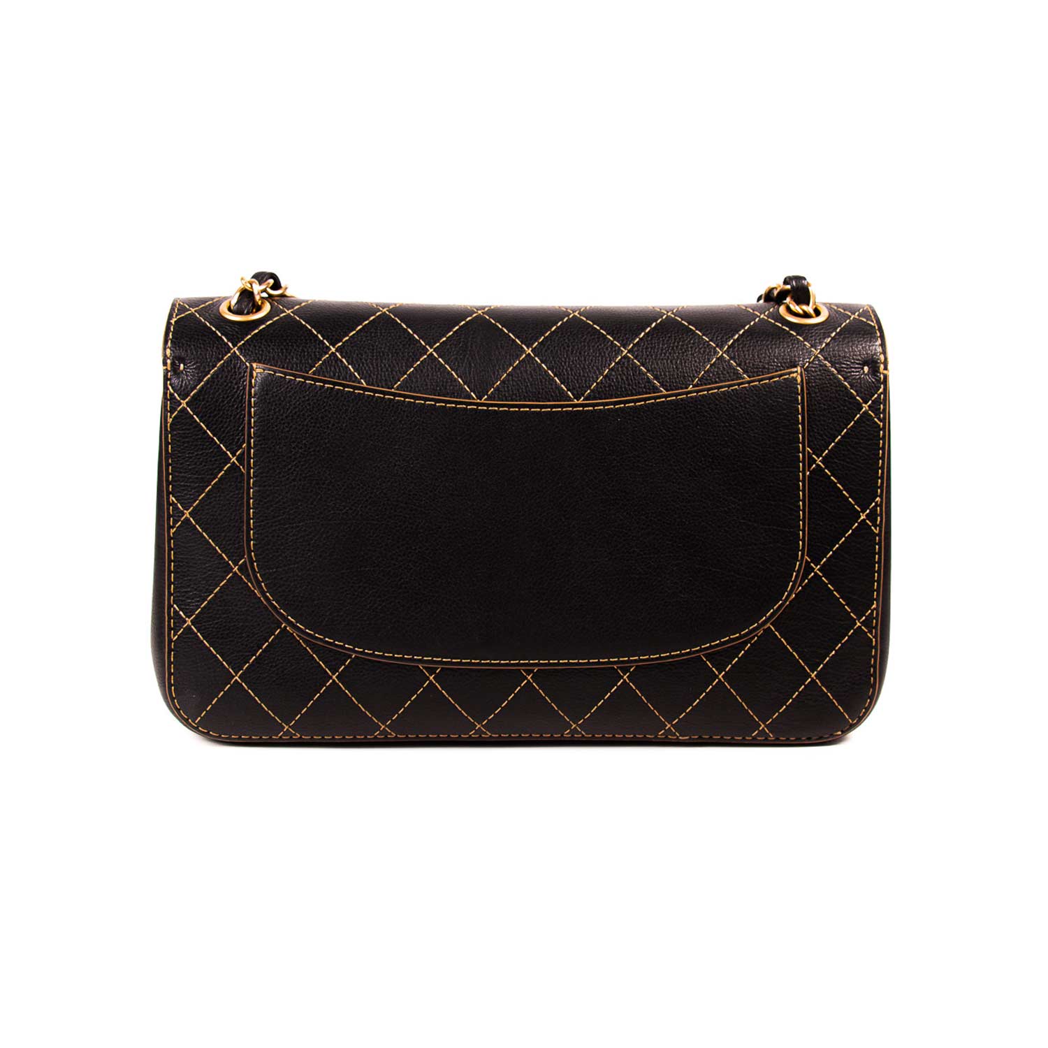 Details: Black Calfskin Leather / Gold-Tone Hardware / Chain-Link and Leather Shoulder Strap / Tan Chamois Lining / Dual Compartments with Two Flat Pockets at Inside / Dual Flap, One with Push-Button and Another with Turn Lock Closure