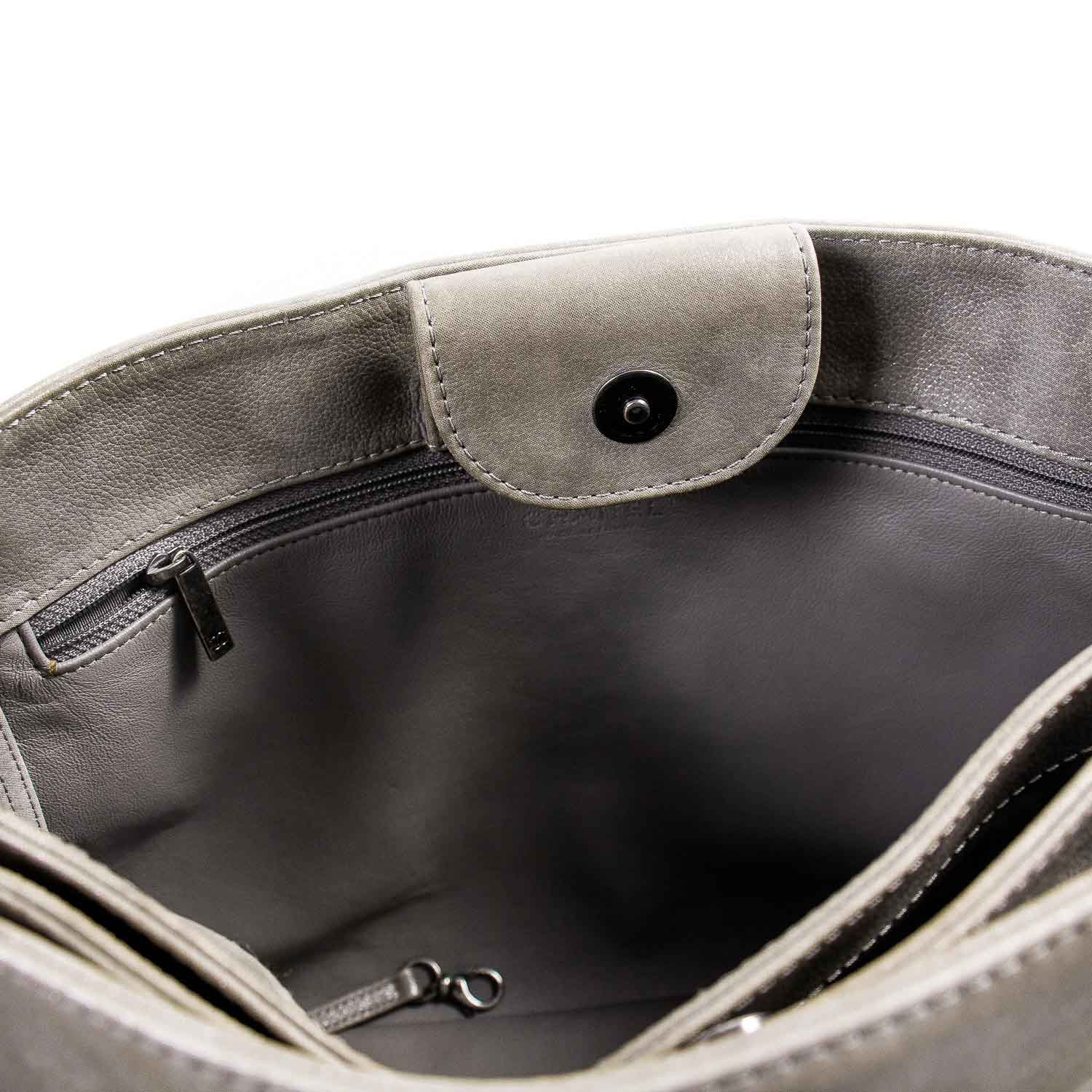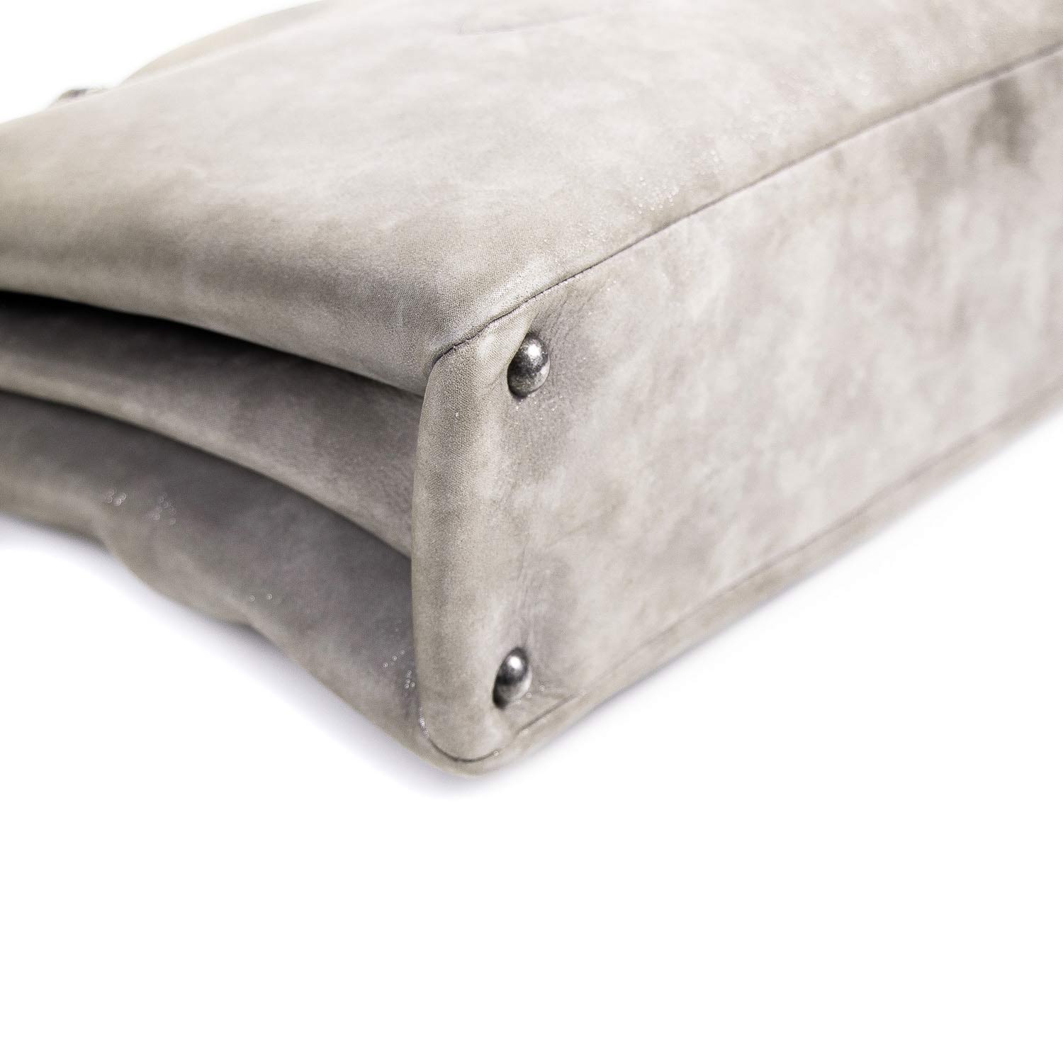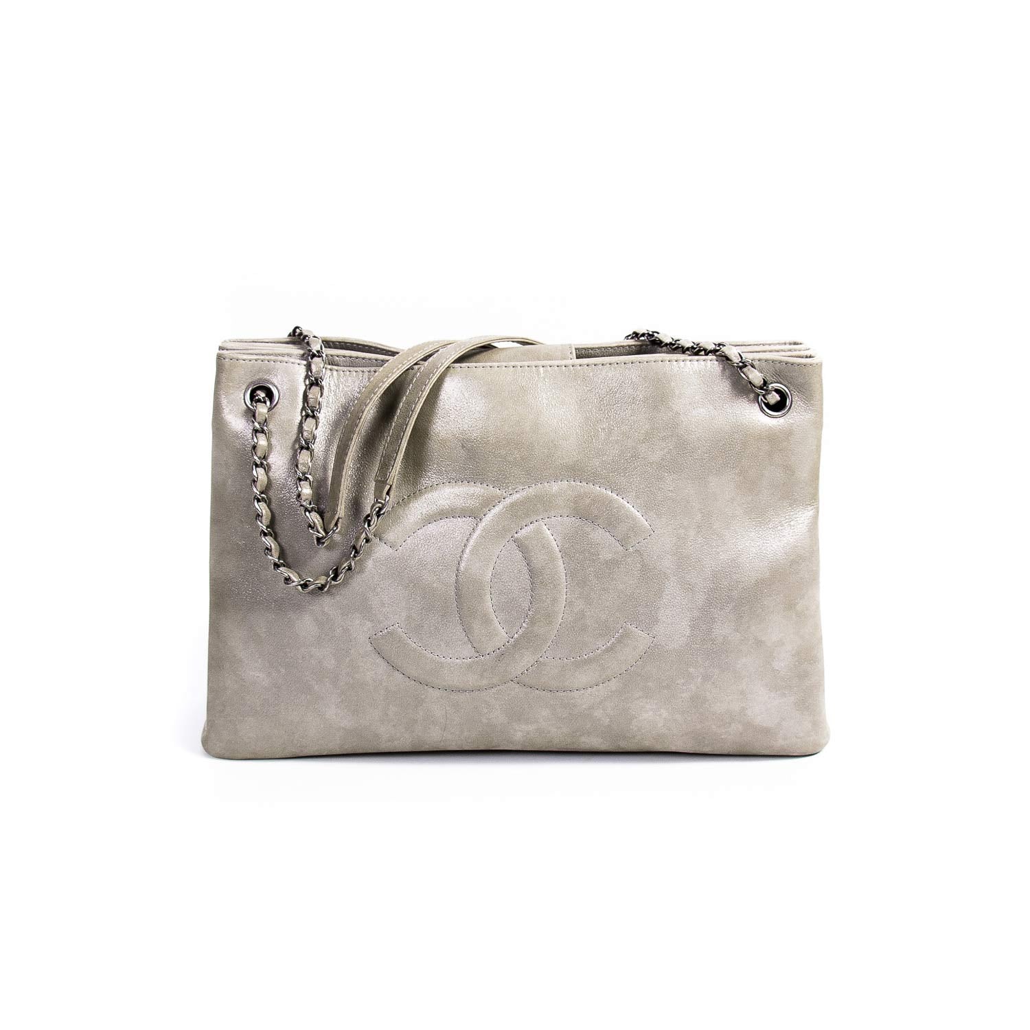 Details: Metallic Grey Leather / Silver-Tone Hardware / Dual Rolled Chain-Link and Leather Shoulder Strap / Stitched Embossed Logo at Front / Three Compartments Separated with Three Pockets