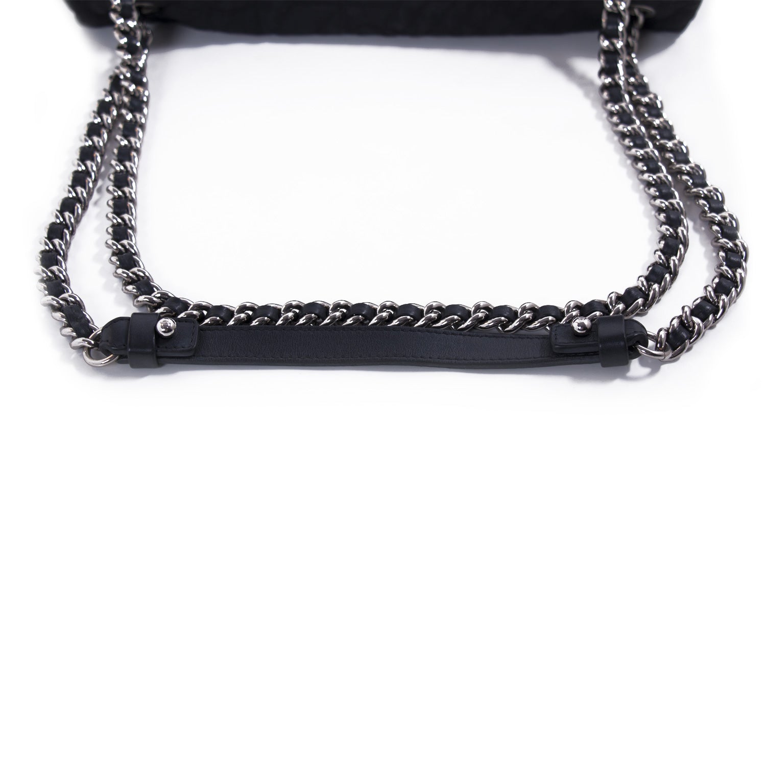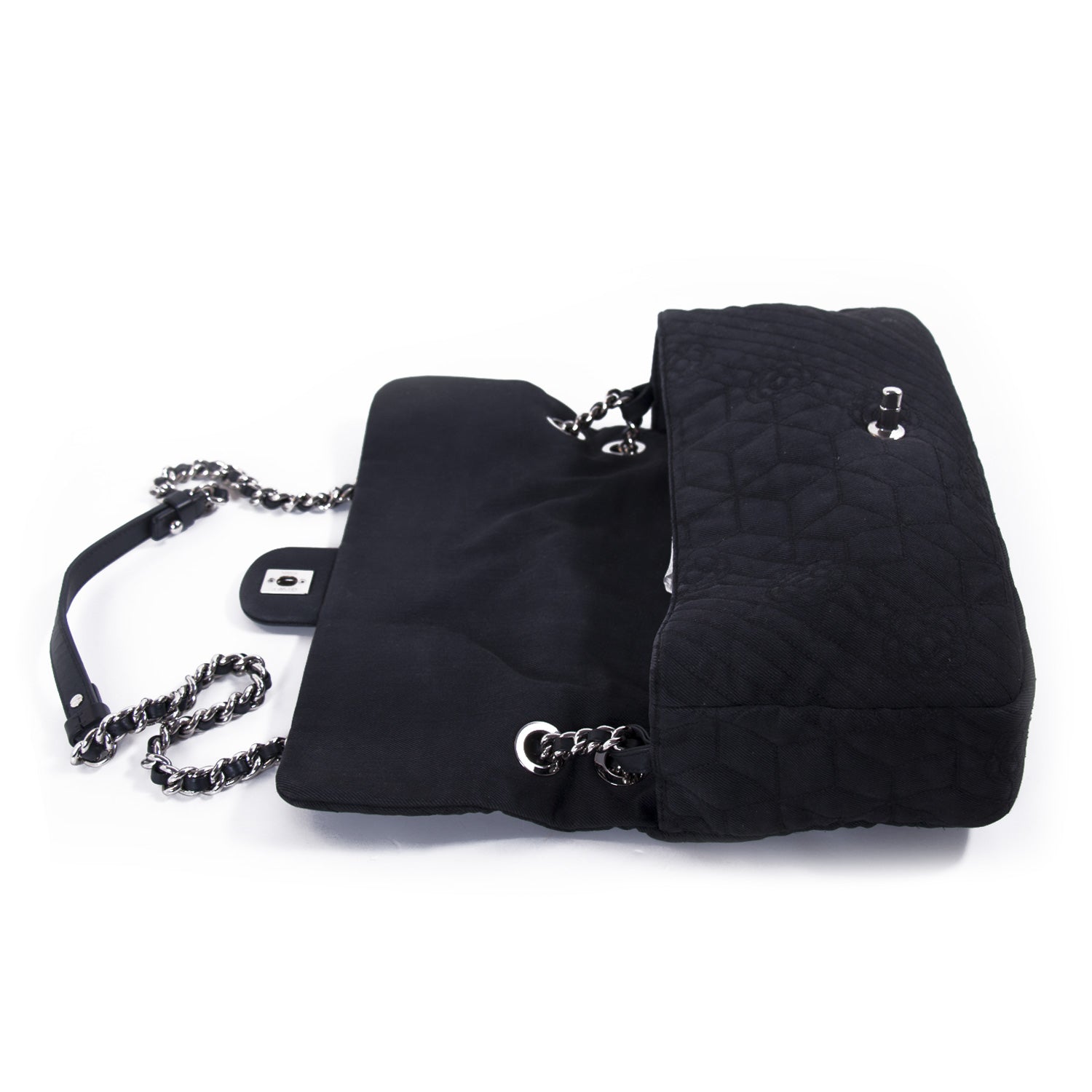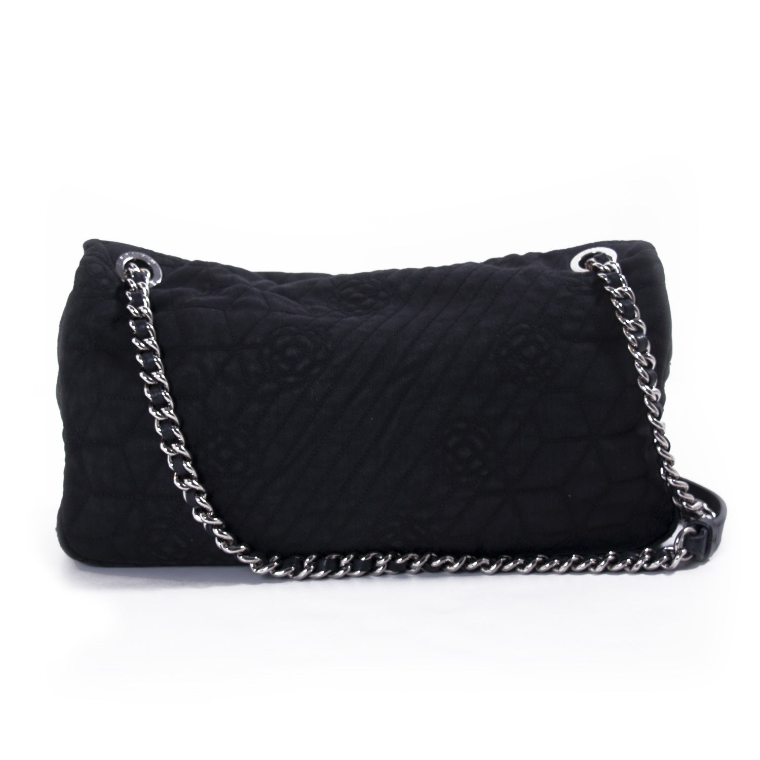 Details: Black Quilted Fabric / Silver-Tone Hardware / Chain-Link and Leather Shoulder Strap / Stitches and Camelia Flowers Throughout the Exterior / Black Canvas Interior Lining / Zipper and Small Flat Pocket at Inside / Turn-Lock Closure at Front Flap