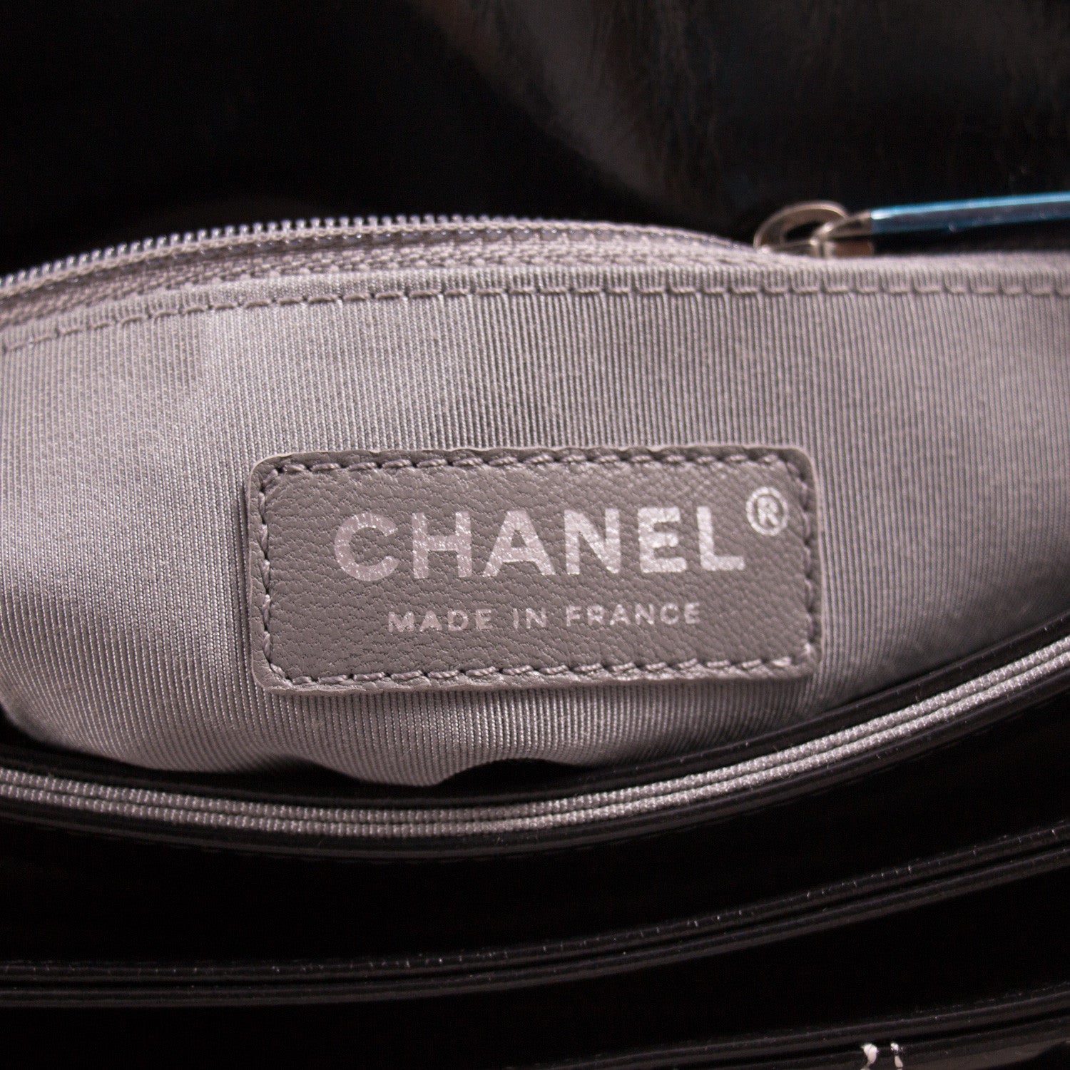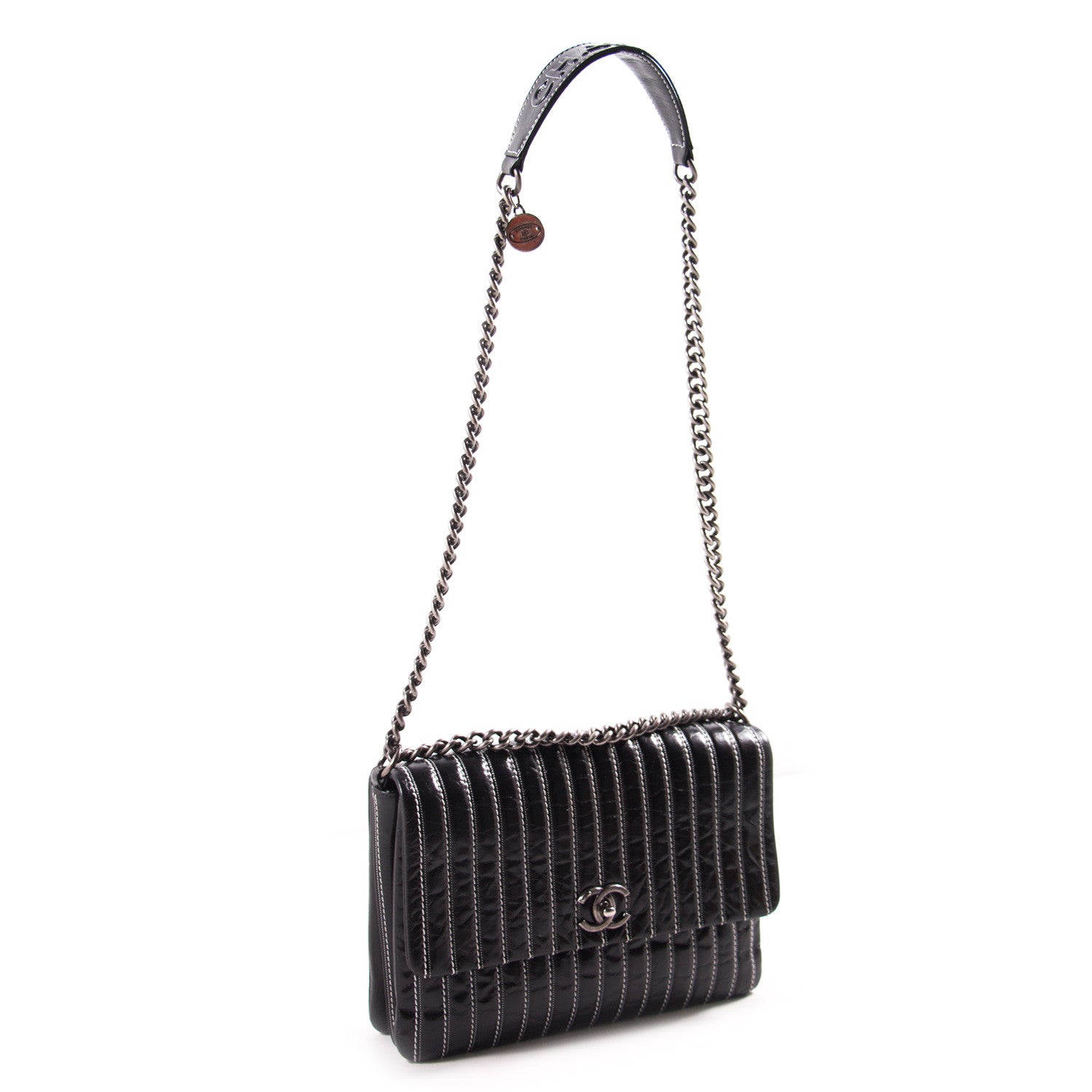 Details: Black Patent Leather / Antiqued Silver Hardware / White Vertical Stitching Pattern / Dual Chain Shoulder Strap With Black Leather Pad / Grey Fabric Interior Lining / Three Compartments / Zip Closure at Interior Wall / CC Turn Lock Closure at Front Flap