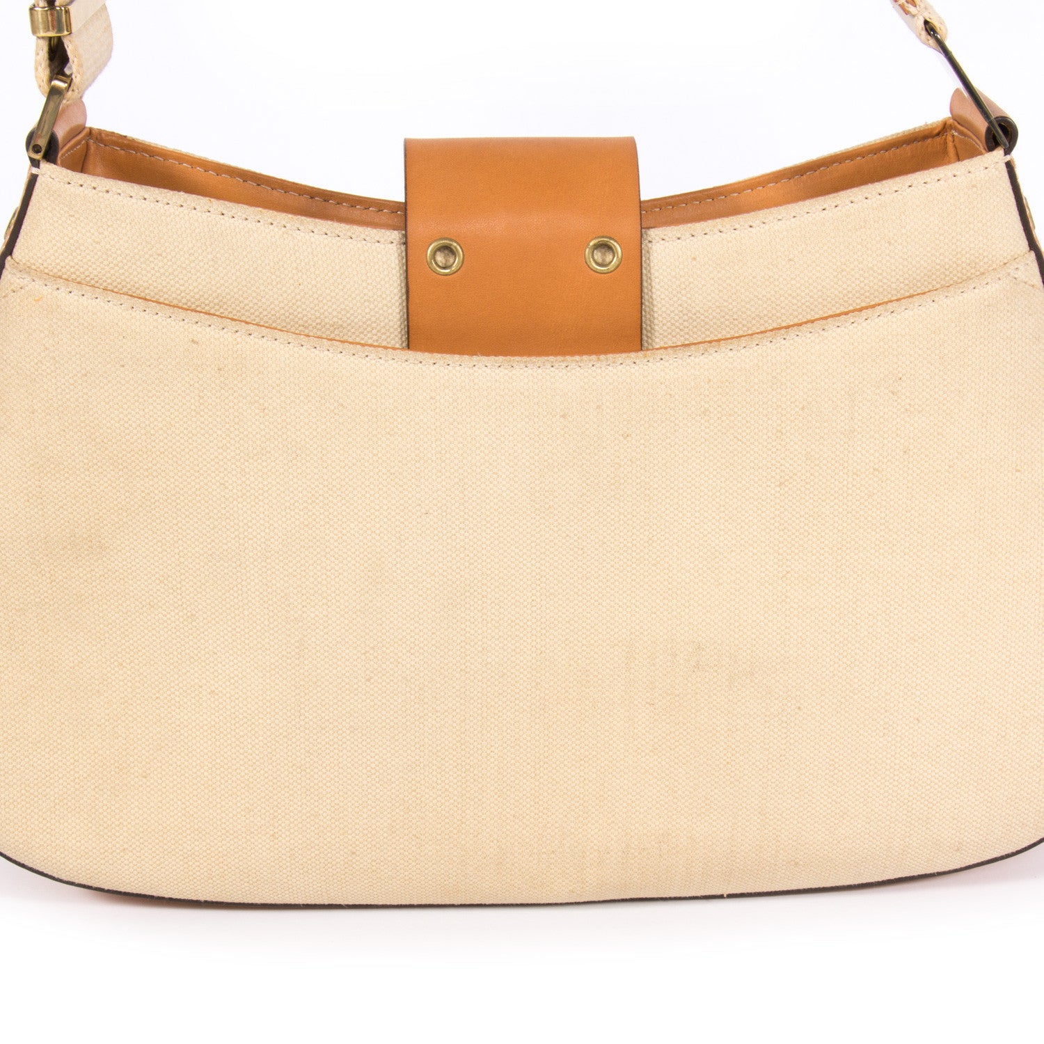 Description: Light Beige Shoulder Bag / Brown Leather Trim / Gold-Tone Hardware / Woven Lining / Interior Zip Pocket / Magnetic Snap Closure at Front Flap