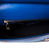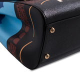 Details: Blue Leather with Black and Brown Prints Throughout / Gold-Tone Hardware / Detachable and Adjustable Shoulder Strap / Single Rolled Handle / Black Fabric Interior Lining / Zipper and Dual Flat Pockets / Magnetic Snap Closure at Top