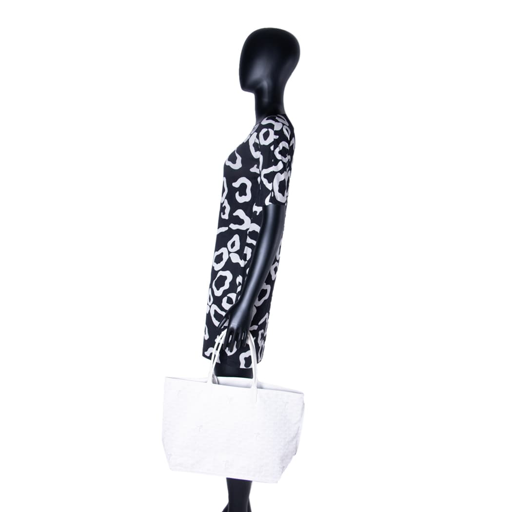 Details: White Goyardine Coated Canvas / Silver-Tone Hardware / Dual Rolled Handles / White Leather Interior / Open Top / Attached Pouch