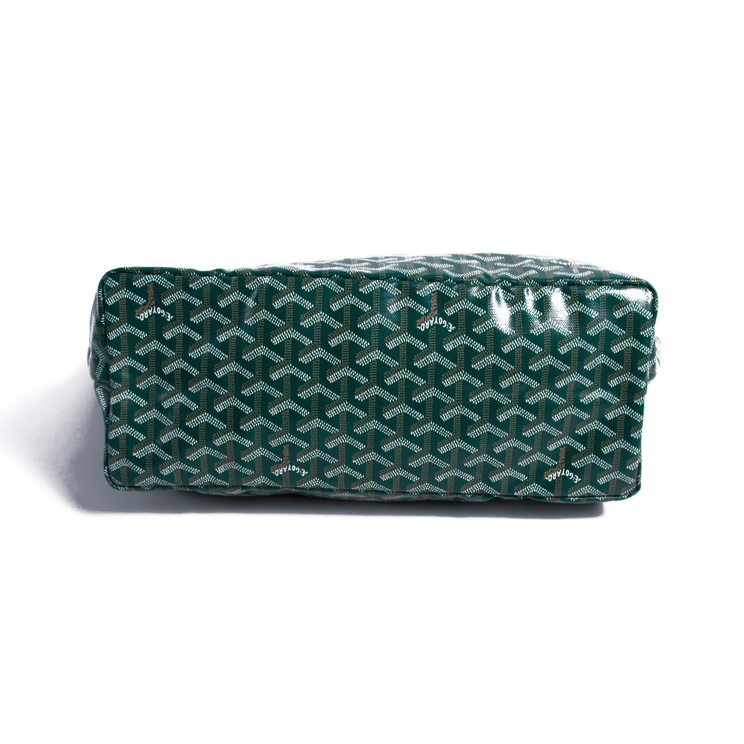 Details: Green, Brown and White Goyardine Coated Canvas / Green Leather Trim / Dual Rolled Handles / Single Compartment / Natural Fabric Lining / Detachable Pocket / Open Top