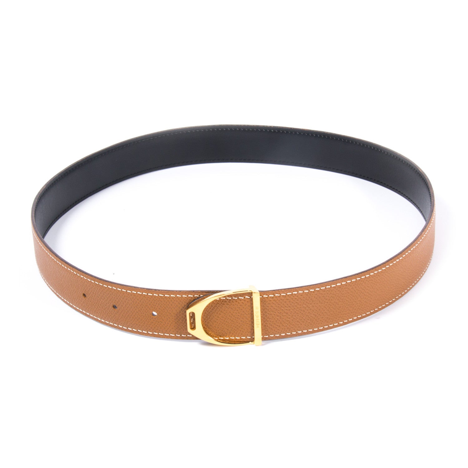 Details: Black And Tan Leather Reversible Belt / Gold Tone Stirrup Buckle / Tonal Stitching Throughout / Peg-In Holes
