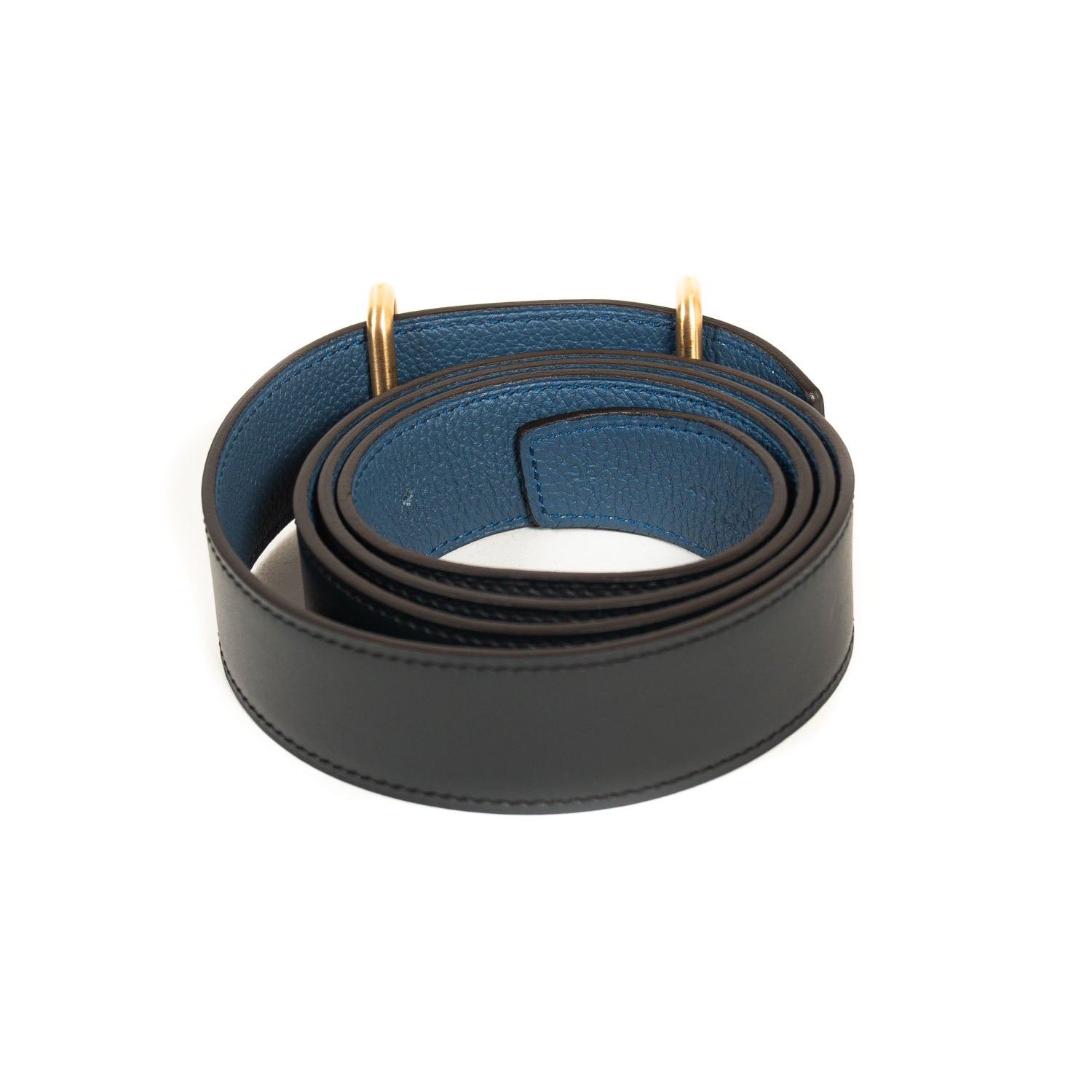 Details: Black and Blue Reversible Calfskin and Togo Leather Strap / Idem Light Gold-Tone Buckle / Peg-In Hole Closure