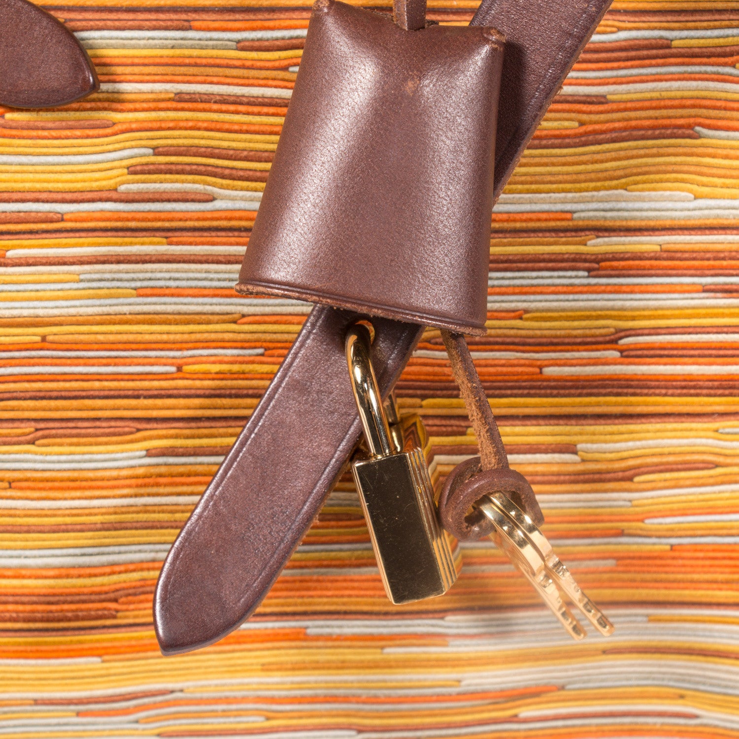 Details: Orange And Multicolor Interchangeable Canvas / Replaceable Brown Canvas / Gold Tone Hardware / Brown Leather Trim On Top / Top Handle With Shoulder Strap / Single Large Compartment With Single Pocket At Interior Wall / Pull-Through Closure At Front Flap