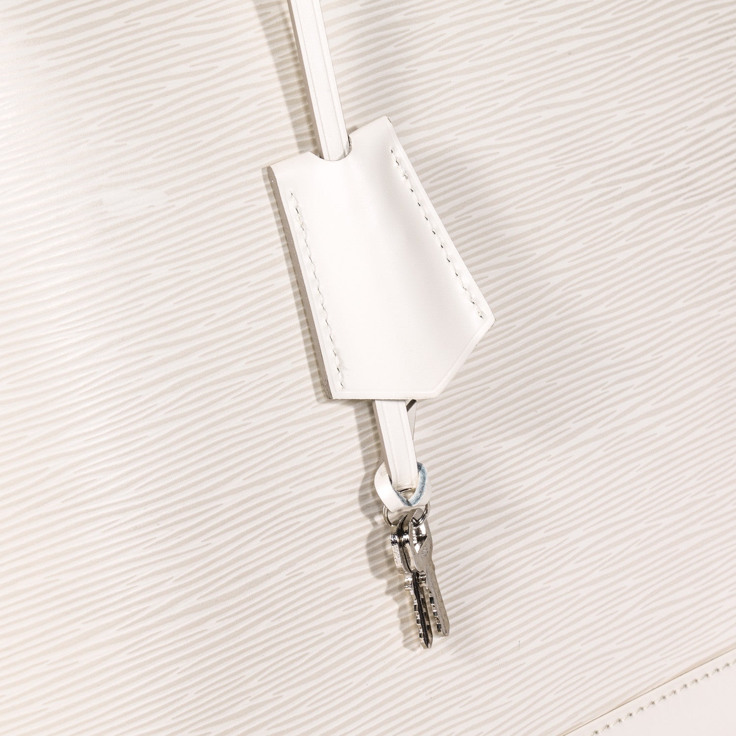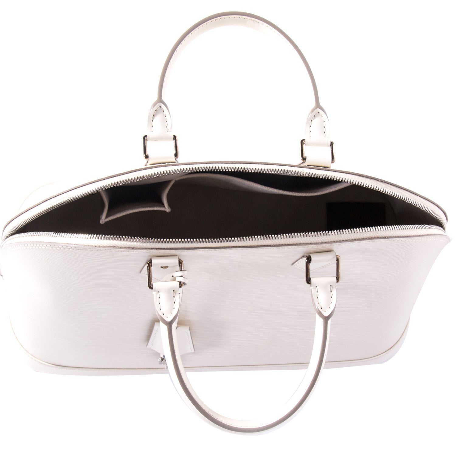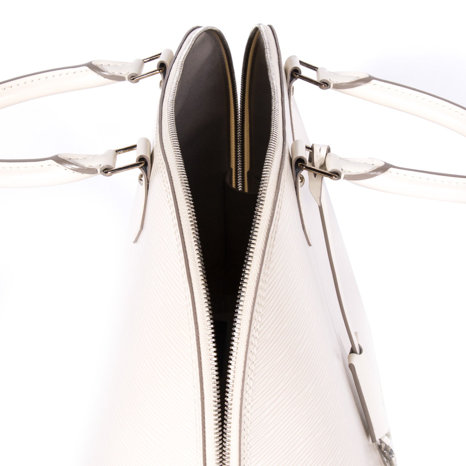 Details: White Epi Leather / Dual Rolled Toron Handles For Comfortable Hand Carry / One Interior Large Pocket / Two Smartphone Pockets / Double Zip Opening For Easy Access / Silver Color Metallic Hardware / Silver Lock and Two Keys /