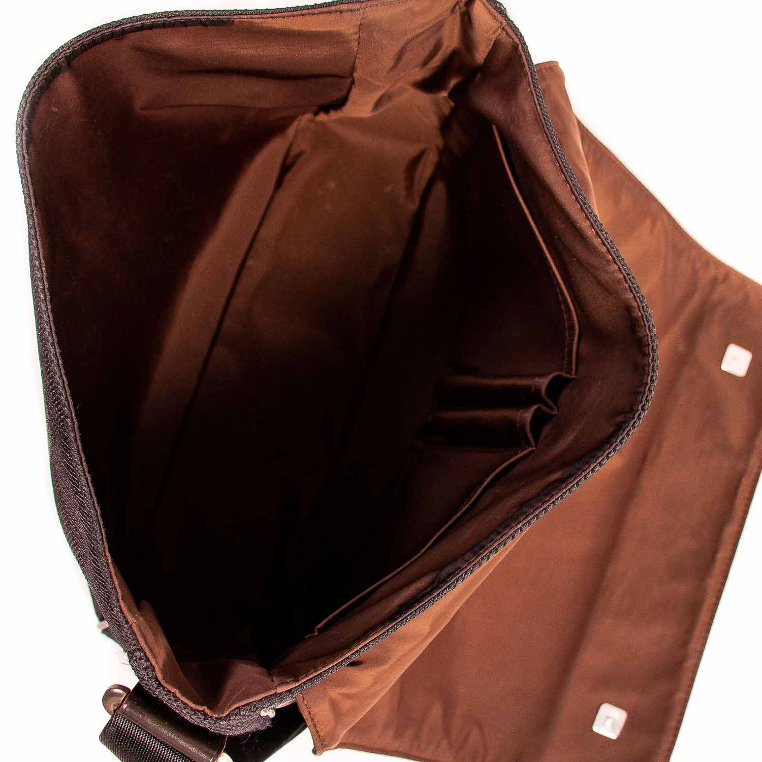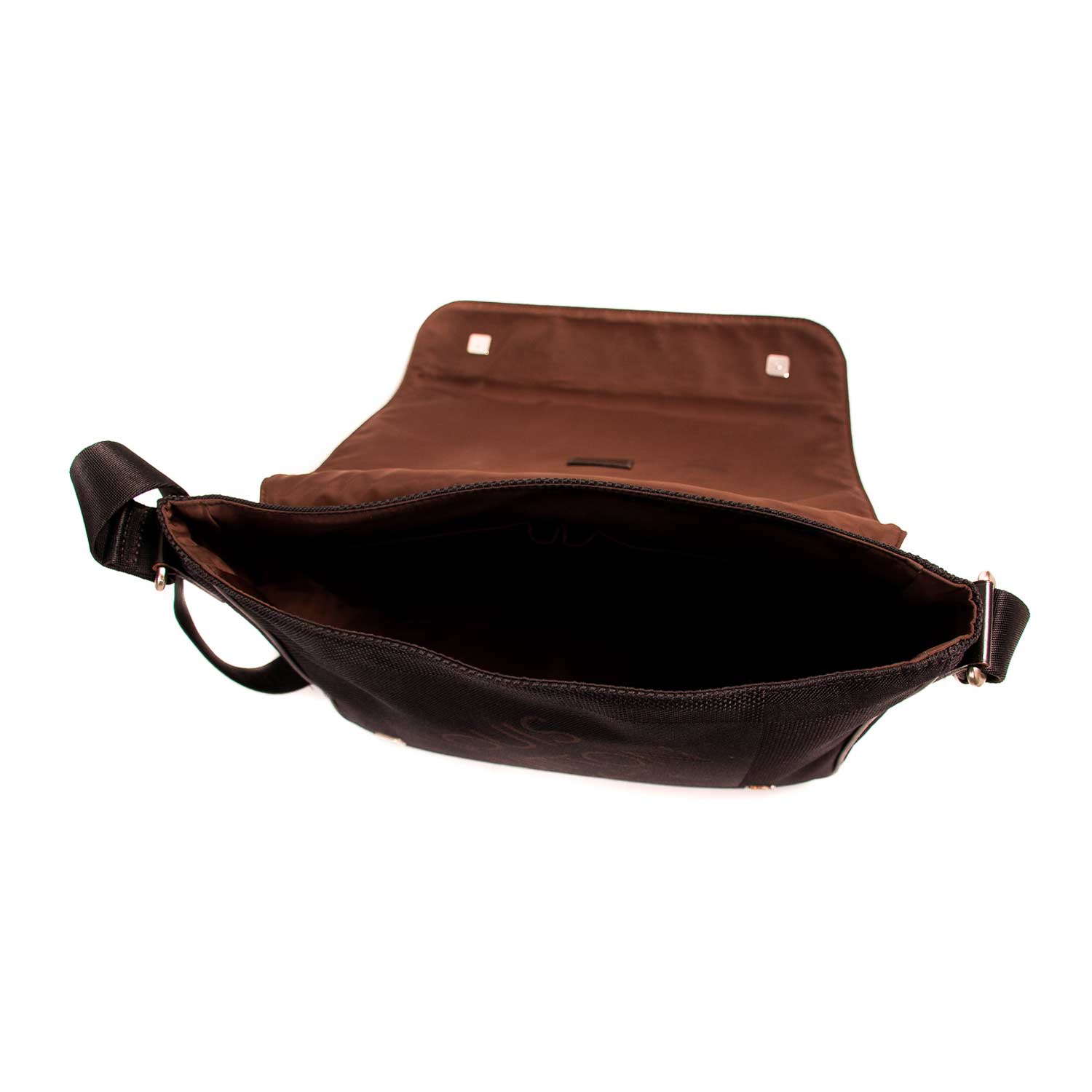 Details: Black Fabric Canvas / Silver Tone Hardware / Adjustable Shoulder Strap / Leather Trim / Exterior Zip Pocket at Back / Single Compartment / Dual Slit Pockets at Interior / Magnetic Snap Closure at Front Flap / Embossed Logo at Front