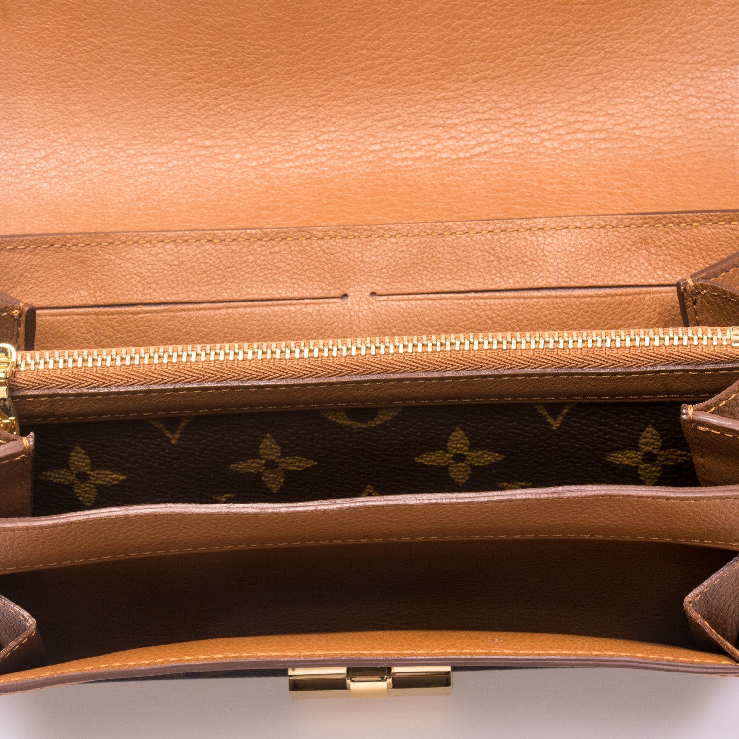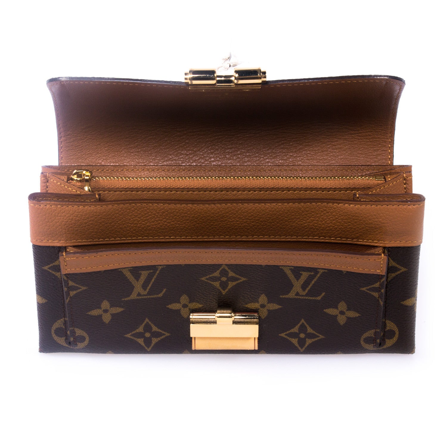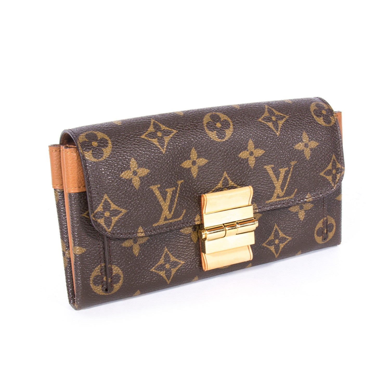 Details: Clutch Wallet / Brown And Tan Coated Monogram Canvas / Flap Front Closure / Vachetta Cowhide Interior Leather / Polished Brass Hardware Clasp / Features Central Zipper Pocket / Twelve Card Slots / Three Compartments /