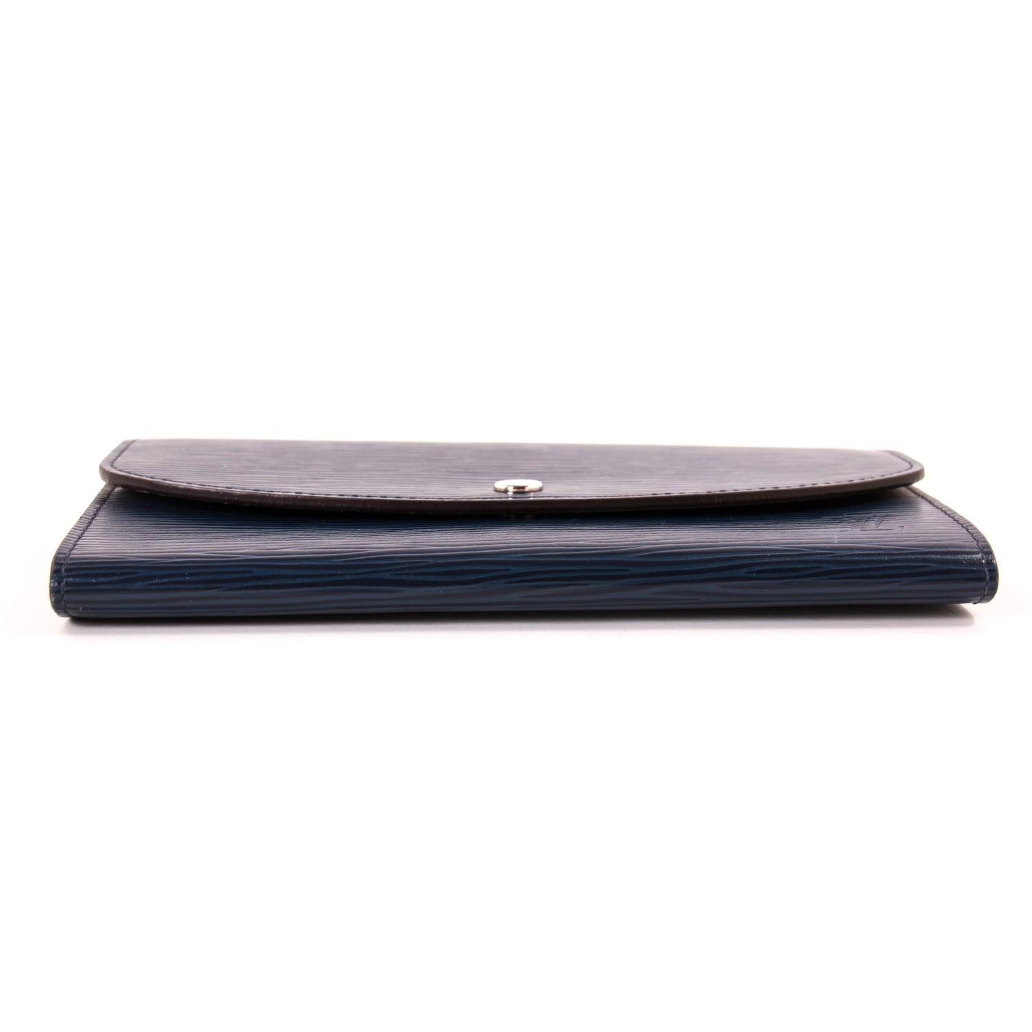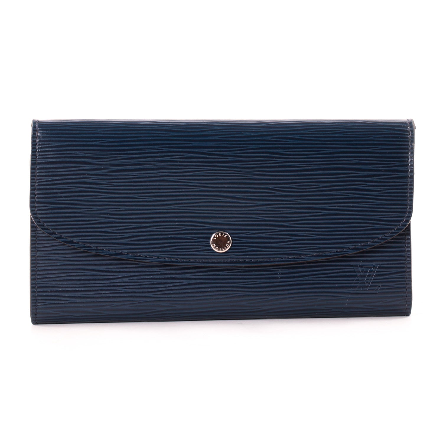Details: Indigo Epi Leather / Silver Hardware / Beige Leather Lining / 4 Cards Slots / Single Zipped Coin Pocket / Dual 2 Flat Compartments / 1 Gusseted Compartment / Push Button Closure at Front Flap