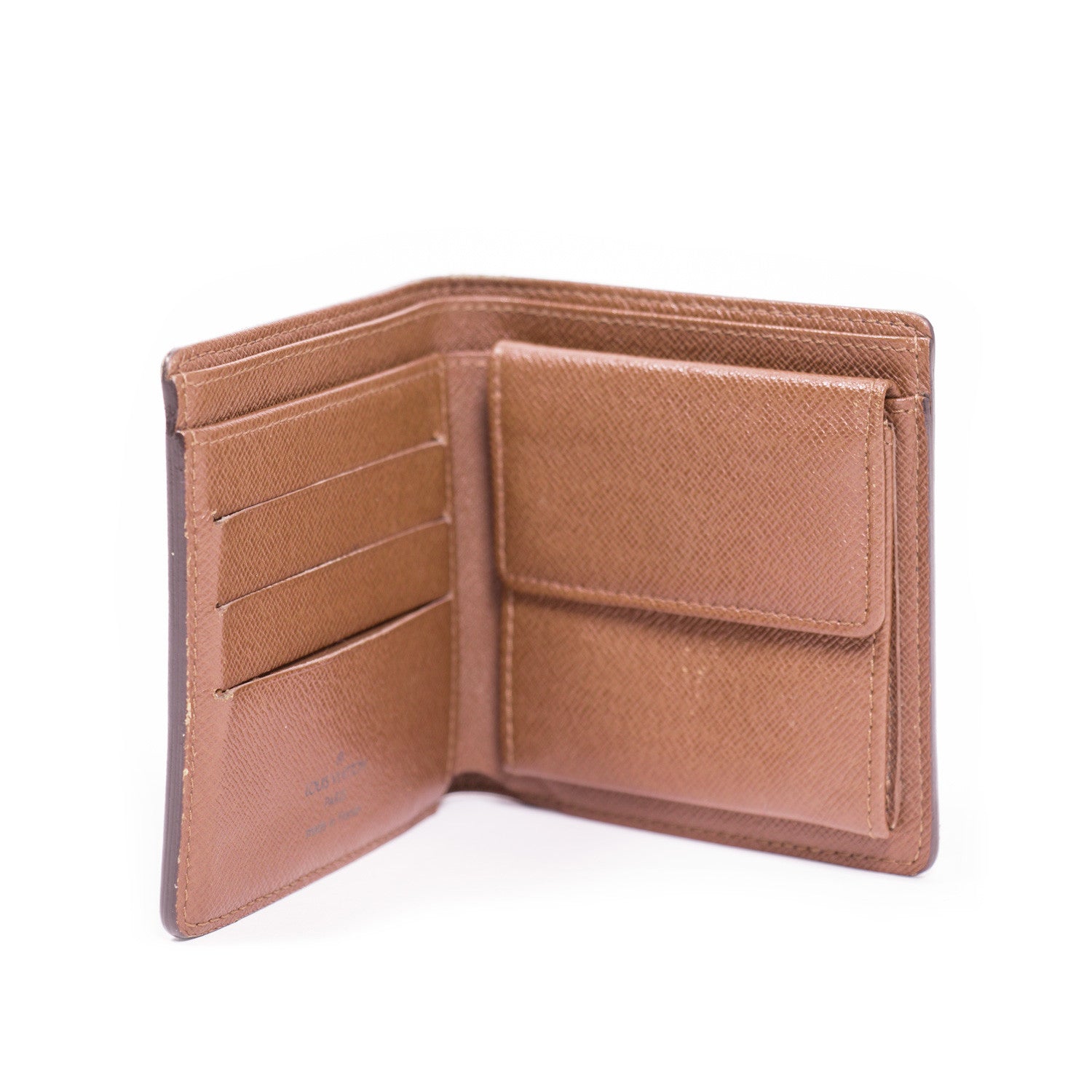 Details: Monogram Canvas / Interior Brown Leather / Cross Grain Leather Lining / Golden Color Metallic Pieces / One Snap-Closure Coin Compartment / Three Credit Card Slots / Two Compartments For Bills / Single Interior Slot For Business Cards