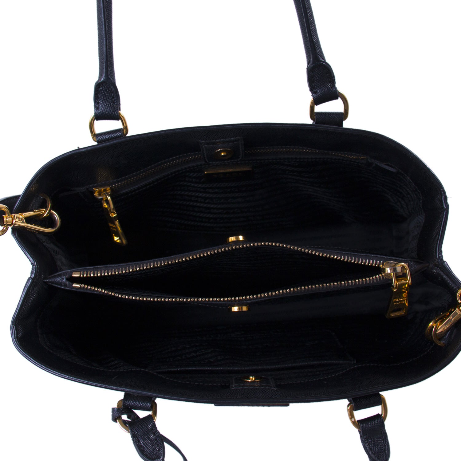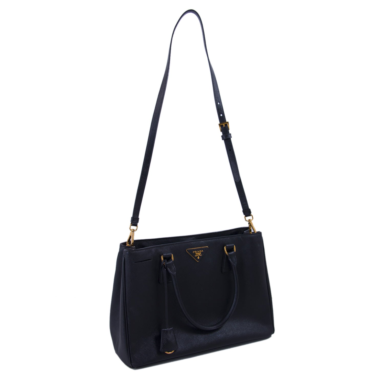 Details: Black Saffiano Leather / Gold-Tone Hardware / Dual Rolled Handles / Detachable and Adjustable Shoulder Strap / Jacquard Interior Lining / Three Compartment, One withZipper Closure / Zipper and Slit Pocket at Inside / Magnetic Snap Closure